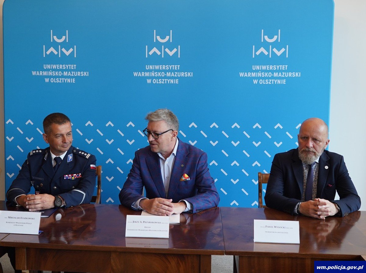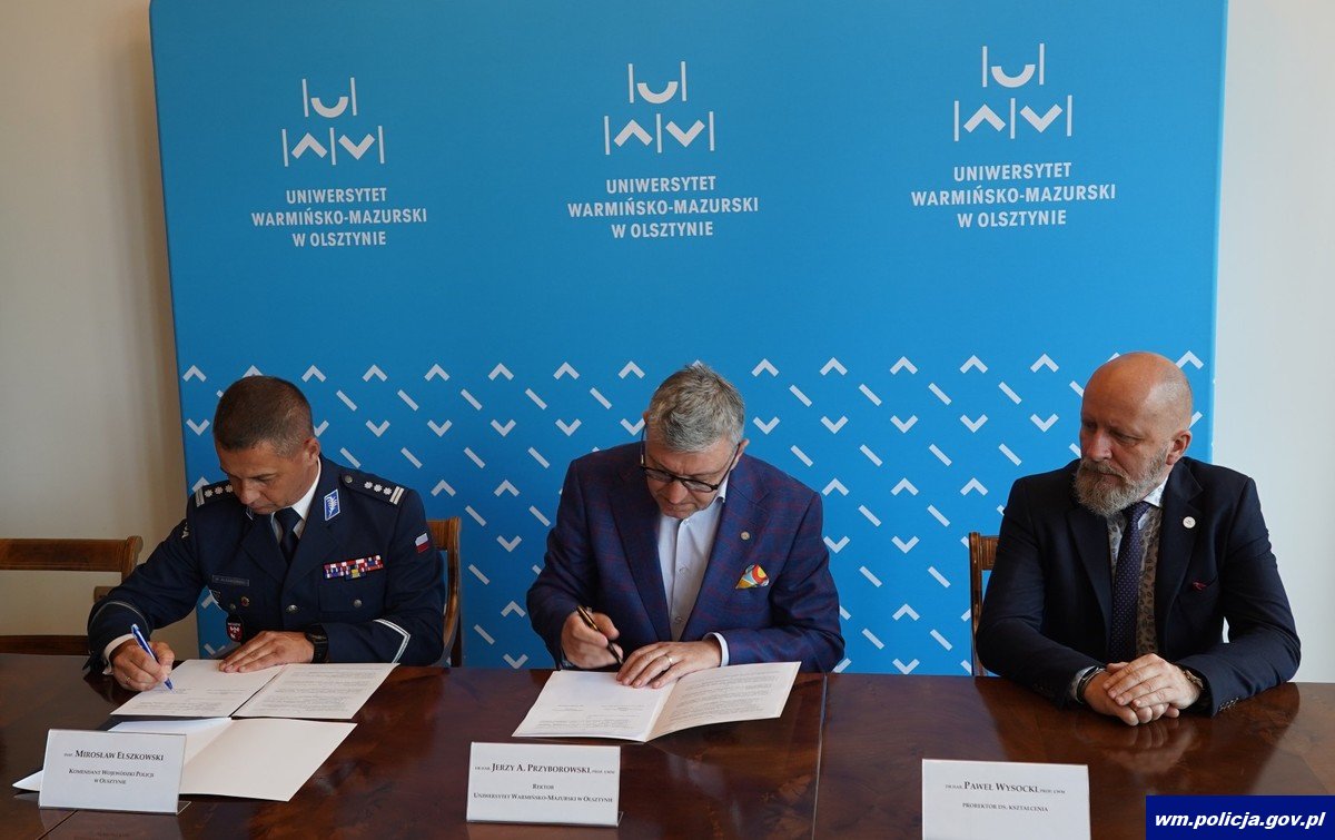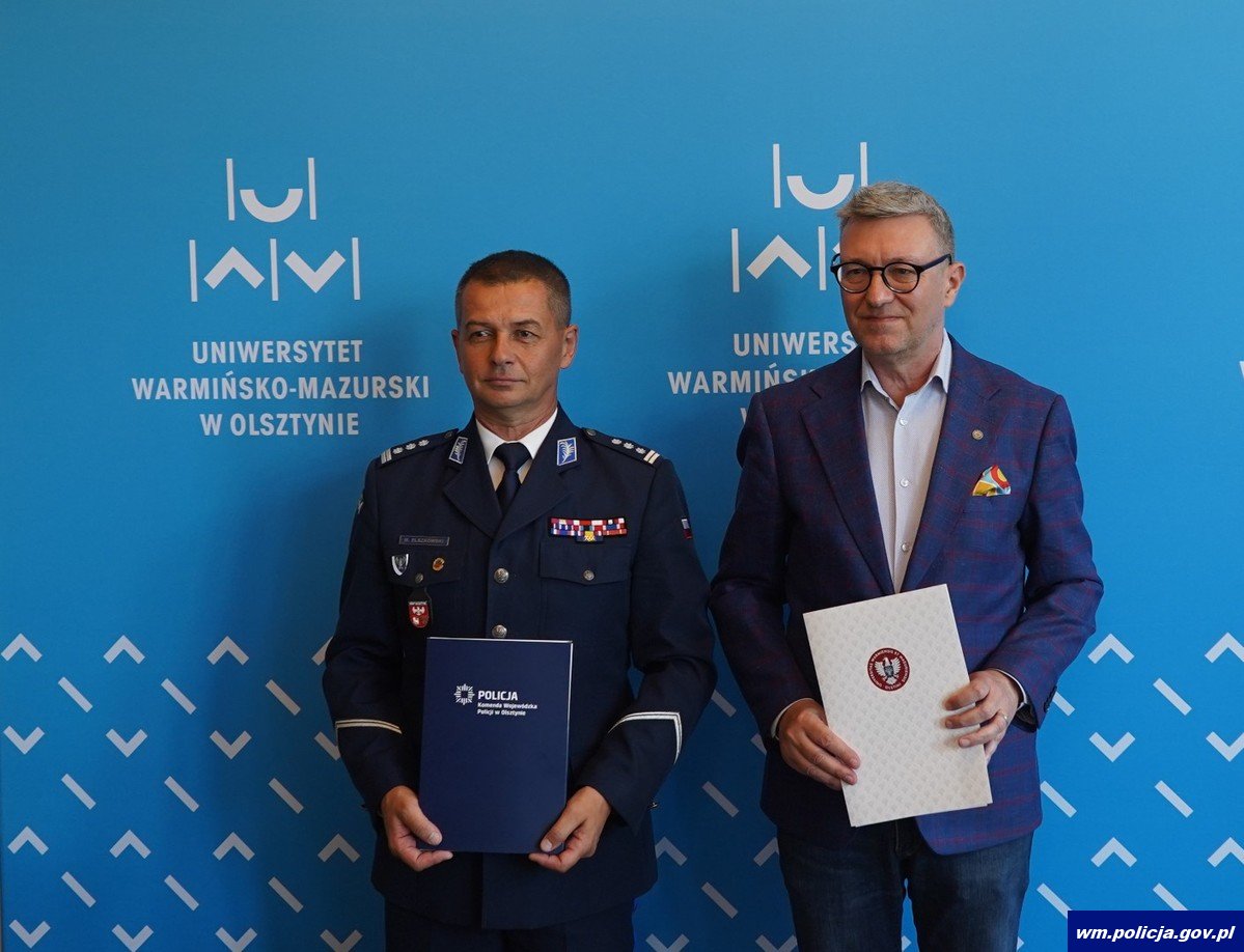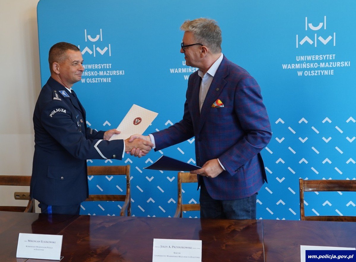 W Olsztynie podpisano dokument dotyczący odnowienia współpracy Uniwersytetu Warmińsko-Mazurskiego w Olsztynie i Komendy Wojewódzkiej Policji w Olsztynie. Jej celem jest podnoszenie poziomu bezpieczeństwa, intensywna współpraca w zakresie kształcenia czy udostępnianie infrastruktury sportowej. Sygnatariusze porozumienia – dr hab. Jerzy Przyborowski, prof. UWM – Rektor Uniwersytetu Warmińsko-Mazurskiego w Olsztynie oraz insp. Mirosław Elszkowski – Komendant Wojewódzki Policji w Olsztynie spotkali się, aby omówić szczegóły bieżącej i przyszłej współpracy.