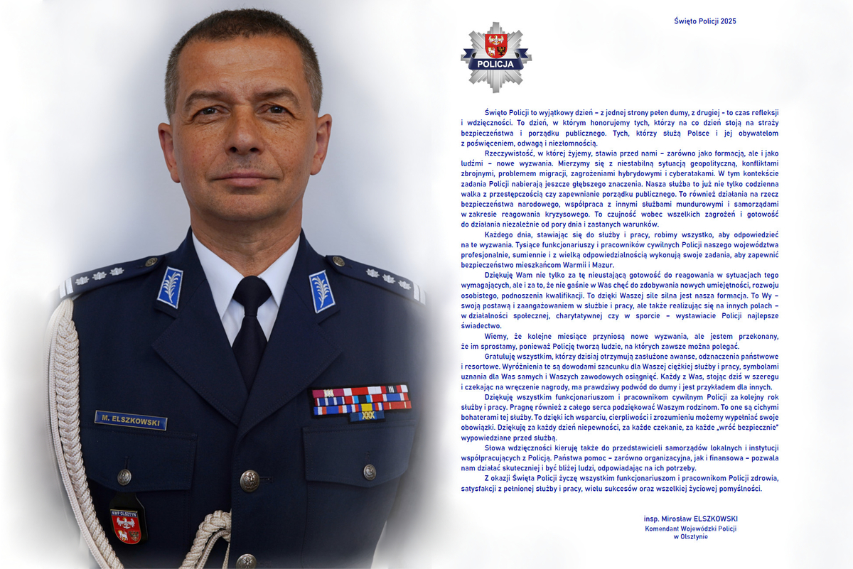 Z okazji obchodów Święta Policji życzenia i podziękowania funkcjonariuszom i pracownikom Policji garnizonu warmińsko-mazurskiego oraz ich rodzinom złożył insp. Mirosław Elszkowski Komendant Wojewódzki Policji w Olsztynie. Wyraził również podziękowania wobec wszystkich instytucji i służb, które współpracują z Policją w regionie na rzecz wspólnego bezpieczeństwa.