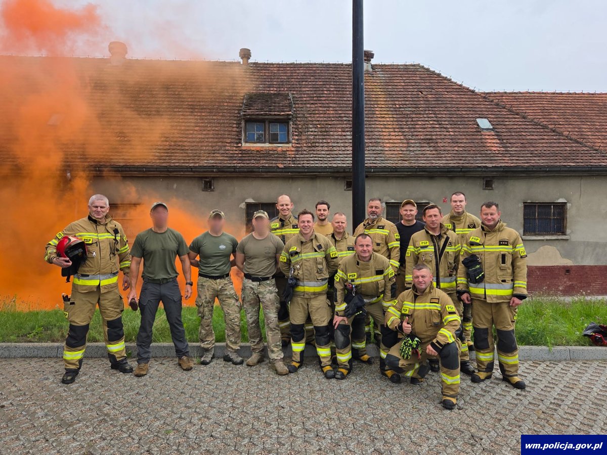 W poniedziałek (21.07.2025 r.) 14 funkcjonariuszy z Komendy Miejskiej Państwowej Straży Pożarnej w Olsztynie rozpoczęło dwudniowe szkolenie w obiektach Komendy Wojewódzkiej Policji w Olsztynie pod okiem policjantów z Samodzielnego Pododdziału Kontrterrorystycznego Policji w Olsztynie. Szkolenie dotyczyło rozpoznania terenu oraz lokali mieszkalnych pod kątem urządzeń wybuchowych w sytuacjach związanych z zaprószeniem ognia w wyniku prawdopodobnego wybuchu. Funkcjonariusze działać musieli w warunkach zbliżonych do tych realnych. Gęste zadymienie, ograniczona widoczność oraz działanie w pełnym wyposażeniu, miały utrudniać strażakom przeszukanie terenu pod kątem odnalezienia niebezpiecznych urządzeń. W trakcie szkolenia policjanci przekazali funkcjonariuszom PSP jak postępować w przypadku odnalezienia materiałów lub urządzeń wybuchowych. Wszystko po to, aby każdy funkcjonariusz wiedział, jak zachować się w takiej sytuacji.