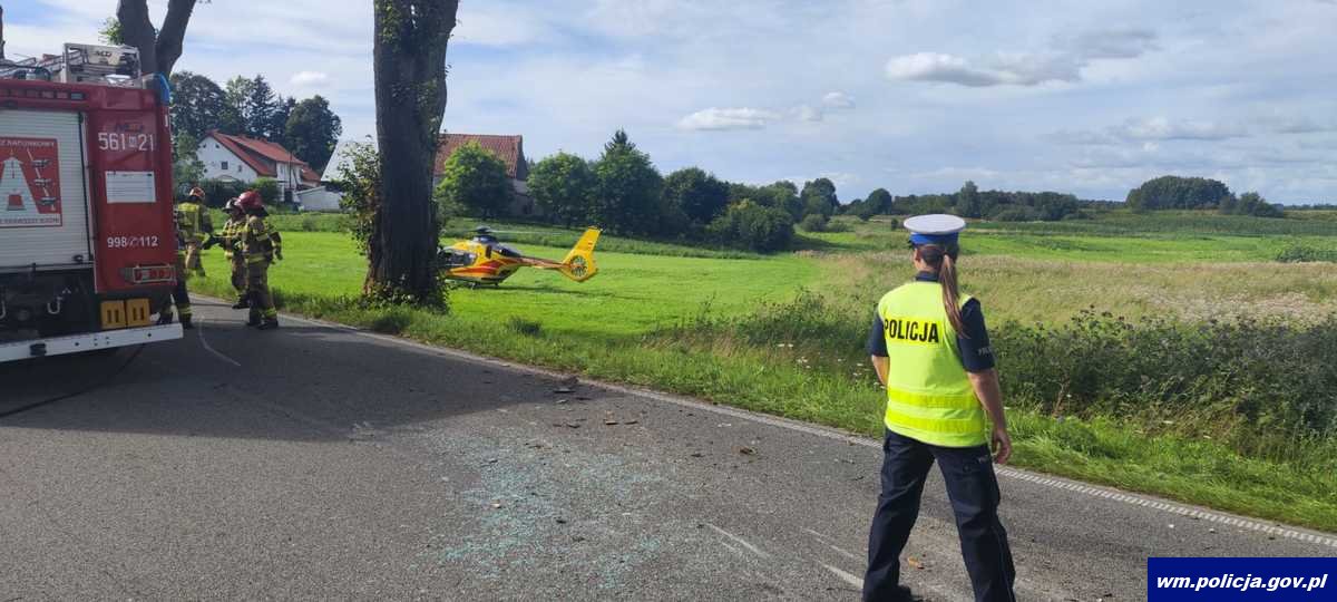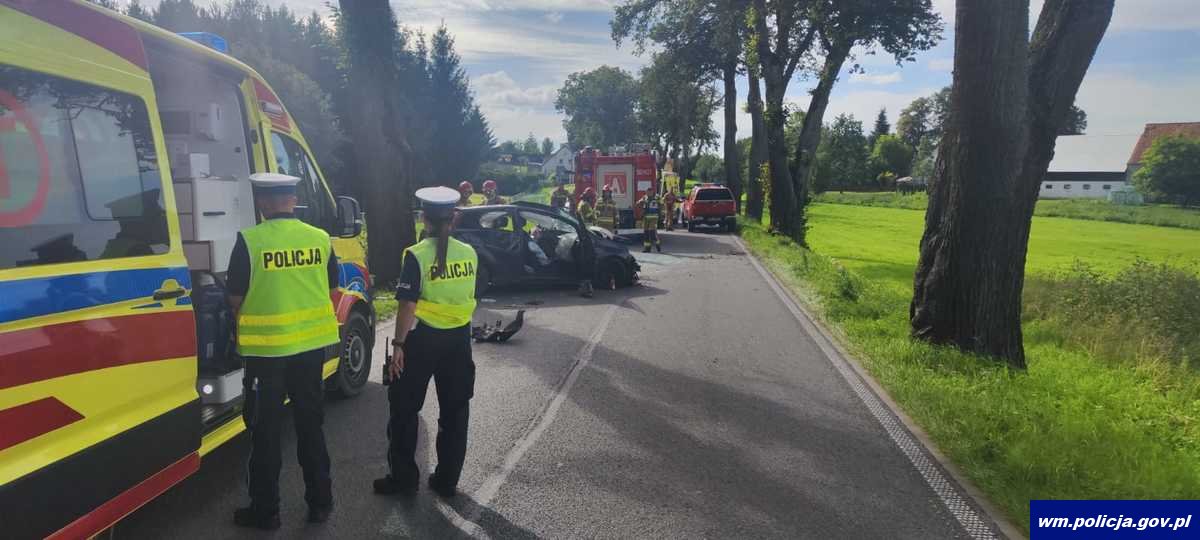 W poniedziałek (11.08.2025) około godziny 15:30 na drodze nr W650 w miejscowości Trygort doszło do zdarzenia drogowego. Kierująca osobowym fiatem z nieustalonej na chwilę obecną przyczyny zjechała na przeciwległy pas ruchu i uderzyła w drzewo.