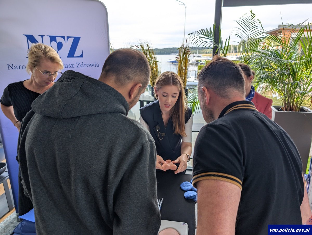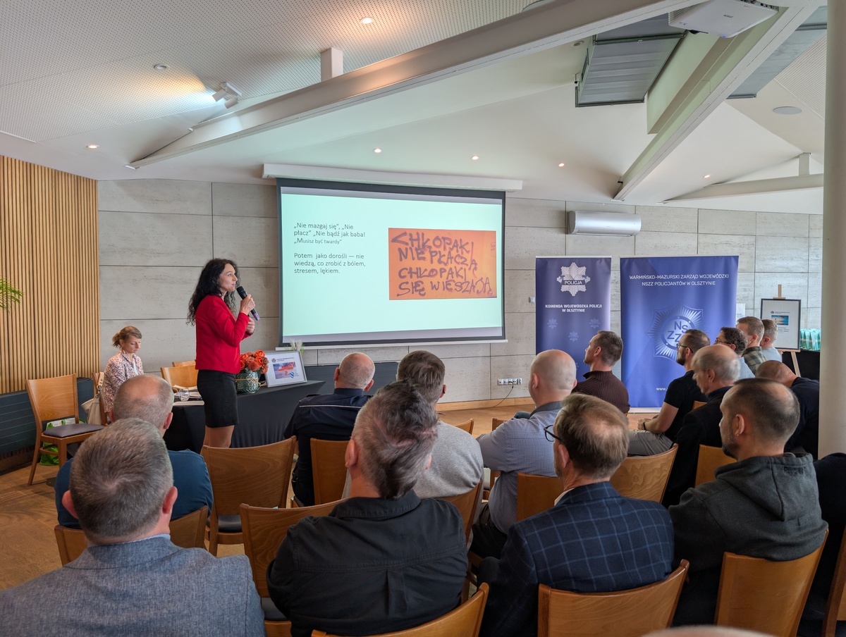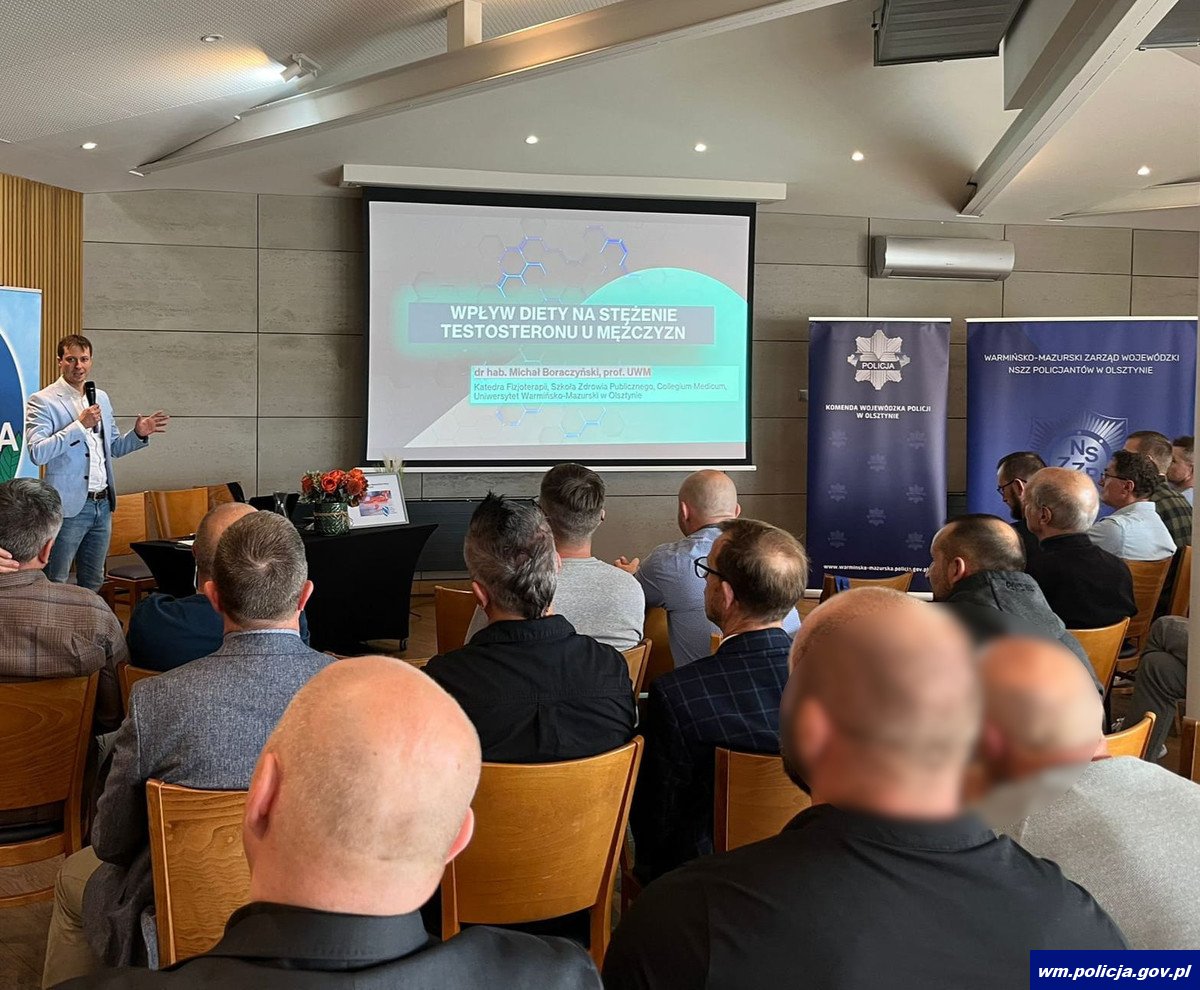 W poniedziałek (29.09.2025 r.) w Przystań Hotel & Restaurant w Olsztynie odbyło się szkolenie „Siła i równowaga. Męskość, zdrowie i stres w codziennej służbie i pracy”. Szkolenie rozpoczął I Zastępca Komendanta Wojewódzkiego Policji w Olsztynie insp. Jarosław Brzozowski, który podkreślił, jak wielką rolę w codziennej służbie odgrywa zdrowie fizyczne i psychiczne oraz jak ważne jest, by policjanci i pracownicy dbali o równowagę między pracą a życiem osobistym. Jego wystąpienie nadało wydarzeniu uroczysty charakter i zwróciło uwagę na priorytet, jakim dla Policji jest profilaktyka zdrowotna i dobrostan funkcjonariuszy i pracowników Policji. Szkolenie wypełniły prelekcje ekspertów z różnych dziedzin: podinsp. Dorota Rak przedstawiła wykład „Męskość w równowadze: równość płci i harmonia między służbą/pracą a życiem osobistym”, asp. szt. Małgorzata Konopko omówiła temat „Męski, czyli jaki? O dążeniu do bycia sobą jako mężczyzna”, dr hab. n. med. Janusz Kocik Dyrektor Szpitala Klinicznego MSWiA z Warmińsko-Mazurskim Centrum Onkologii w Olsztynie mówił m.in. o chorobach cywilizacyjnych w wykładzie „Styl życia mężczyzn - funkcjonariuszy”, Pani Jadwiga Ślusarska-Kopala - konsultant wojewódzki w dziedzinie mikrobiologii lekarskiej ww. szpitala przedstawiła zagadnienia dotyczące mikrobiomu i mózgu, Pani Aleksandra Kuczko z Narodowego Funduszu Zdrowia omówiła temat „Zdrowie mężczyzny”, dr hab. Michał Boraczyński z Uniwersytetu Warmińsko-Mazurskiego w Olsztynie przedstawił wpływ diety na stężenie testosteronu u mężczyzn, a dr hab. n. med. Roman Sosnowski lekarz kierujący kliniką urologii i onkologii urologicznej szpitala MSWiA mówił o roli profilaktyki urologicznej w długim życiu i dobrej formie. Program szkolenia uzupełniały przerwy kawowe i wspólny obiad, które sprzyjały rozmowom i wymianie doświadczeń. W trakcie szkolenia uczestnicy mogli także skorzystać ze specjalnych stoisk: edukacyjnego NFZ z fantomami piersi i jąder do nauki samobadania oraz diagnostycznego prowadzonego przez dietetyk Annę Mularczyk, umożliwiającego sprawdzenie składu ciała.