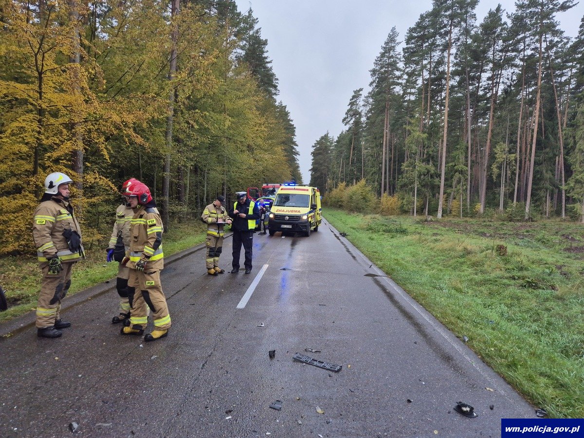 Nidziccy policjanci pracowali na miejscu wypadku drogowego, do którego doszło w niedzielę (12.10.2025 r.) około godz. 7:30 na drodze wojewódzkiej W545 w pobliżu miejscowości Moczysko. Ze wstępnych ustaleń policjantów wynika, że na prostym odcinku drogi 19-latek kierujący samochodem osobowym marki Toyota zjechał na przeciwległy pas ruchu, po czym doprowadził do zderzenia czołowego z jadącym z przeciwnego kierunku samochodem osobowym marki Peugeot, którym przemieszczał się 34-letni kierujący wraz z 32-letnią pasażerką. Obaj kierujący byli trzeźwi. Wszyscy uczestnicy zdarzenia drogowego z uwagi na obrażenia powstałe na skutek zderzenia zostali hospitalizowani. Policjanci będą wyjaśniali szczegółowe przyczyny i okoliczności tego wypadku drogowego.