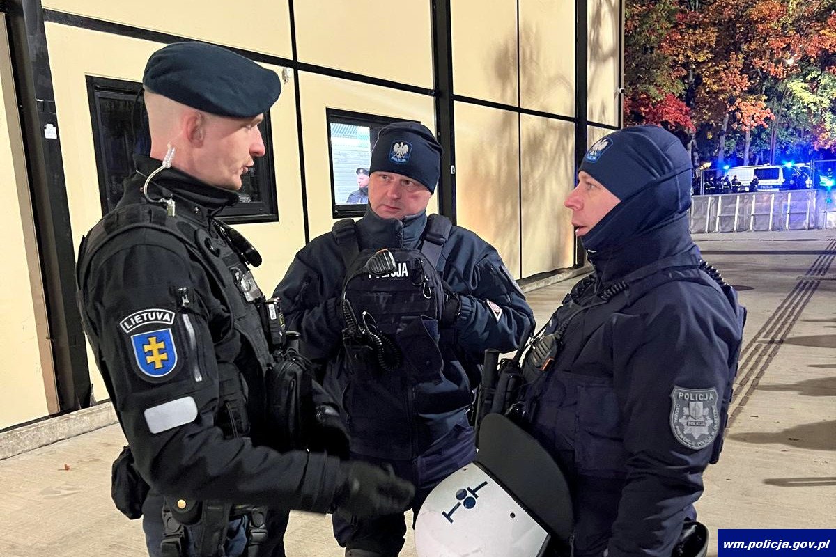 Zabezpieczenie meczów piłkarskich to chleb powszedni policjantów z Oddziału Prewencji Policji w Olsztynie. Tym razem jednak, po raz pierwszy w historii prawie 50 funkcjonariuszy na takie zabezpieczenie wyjechało z Olsztyna poza granice kraju. W niedzielę (12.10.2025) w Kownie policjanci z Oddziału Prewencji Policji w Olsztynie jako jedyni z kraju stanęli ramię w ramię z litewskimi policjantami, by zadbać o spokojny przebieg sportowej rywalizacji. Zabezpieczyli przemarsz kibiców, spokojną atmosferę pod stadionem oraz uporządkowane wyjście z niego po zakończeniu rywalizacji. Dzięki temu nie doszło do żadnych zakłóceń porządku publicznego przez pseudokibiców, którzy niestety również byli obecni w tłumie kibicującym polskiej reprezentacji.