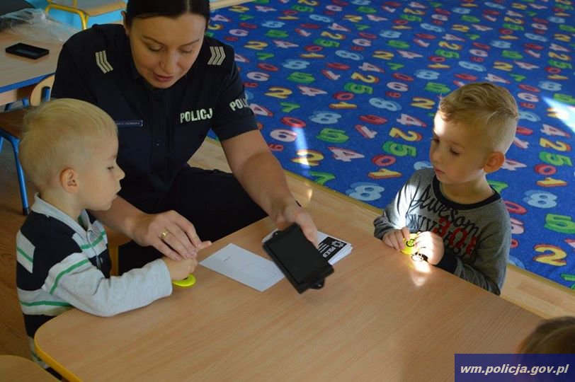 Niecodzienne zajęcia edukacyjne odbyły się w Niepublicznym Przedszkolu Leśny Dworek w Nowym Mieście Lubawskim. Co robią policjanci, kiedy i jak wezwać ich na pomoc i jak prawidłowo zachować się na drodze, na placu zabaw i w domu - to treści, które poznały przedszkolaki. Na zakończenie spotkania każde dziecko otrzymało zawieszkę odblaskową i miało możliwość zostawić swoje odciski palców.