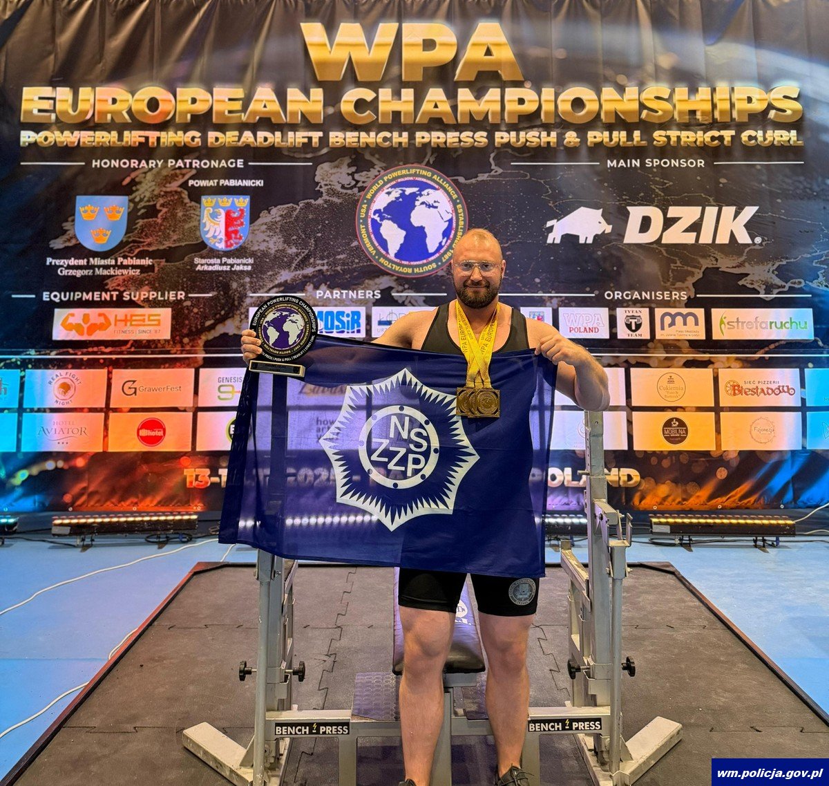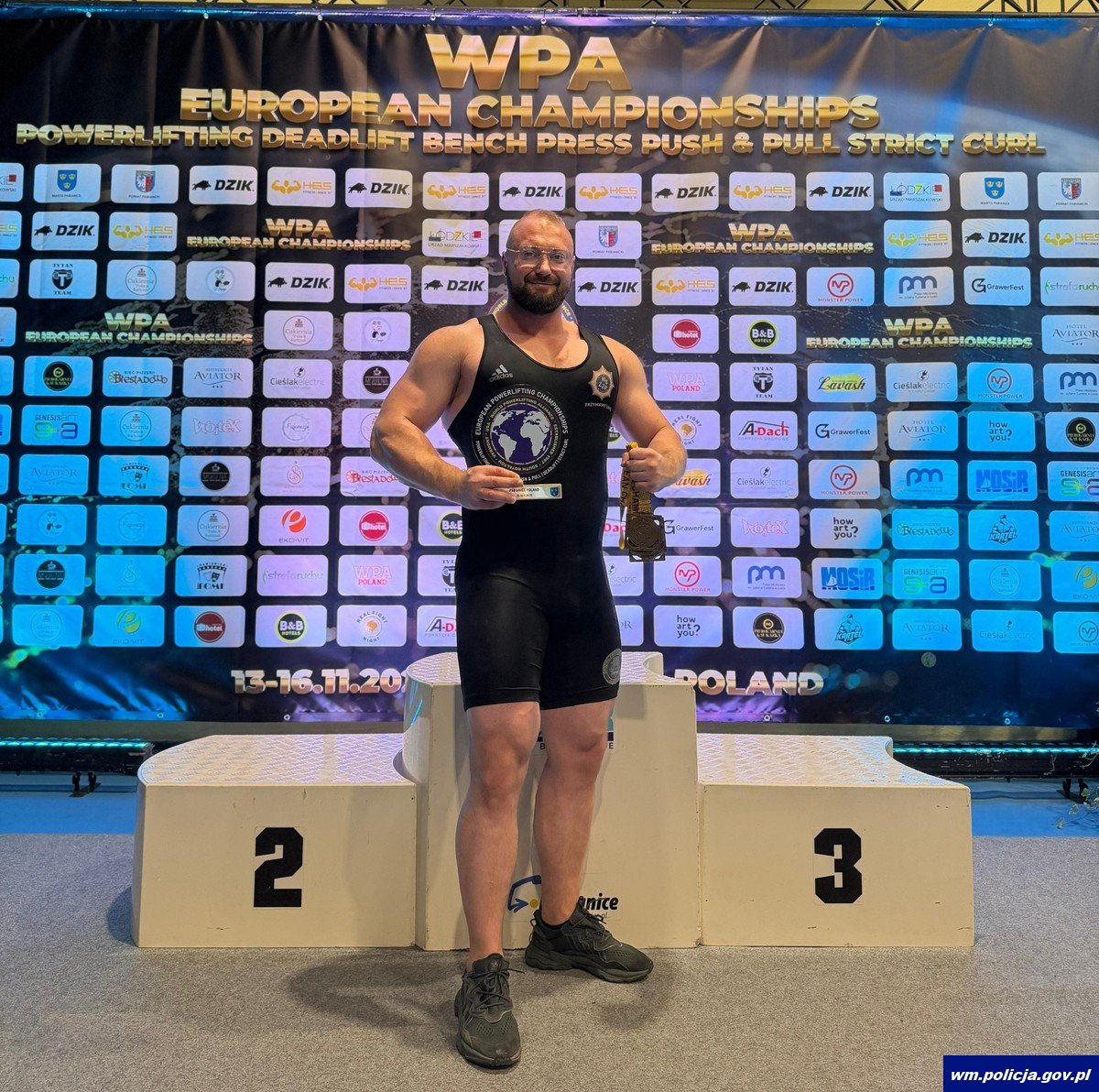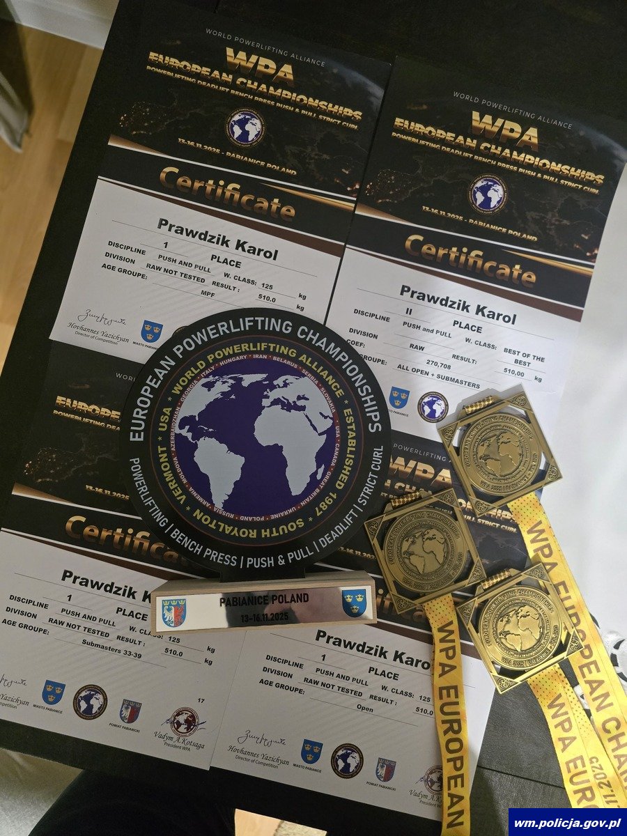 Mł. asp. Karol Prawdzik, funkcjonariusz Wydziału Kryminalnego KPP w Gołdapi i reprezentant Polskiej Policji, zdobył trzy tytuły Mistrza Europy oraz wicemistrzostwo Europy podczas Mistrzostw Europy w sportach siłowych, które odbyły się w dniach 13–16 listopada 2025 roku w Pabianicach. Jego łączny wynik 510 kg w konkurencji push pull okazał się najlepszym rezultatem zawodów w kategorii do 125 kg.