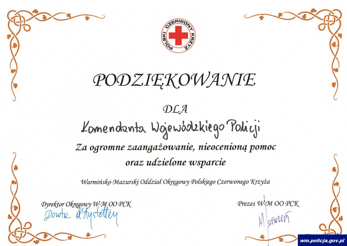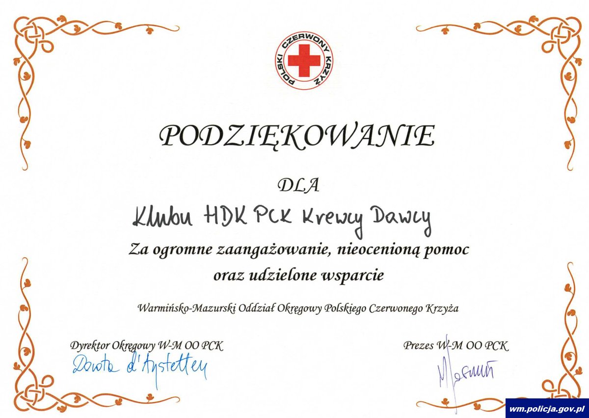 W Warmińsko-Mazurskim Urzędzie Wojewódzkim w Olsztynie odbyła się Okręgowa Gala Krwiodawstwa i Wolontariatu. Organizatorem uroczystego spotkania był Warmińsko-Mazurski Oddział Okręgowy Polskiego Czerwonego Krzyża w Olsztynie. To wyjątkowe wydarzenie było okazją do uhonorowania osób i instytucji, które bezinteresownie wspierają system krwiodawstwa i wolontariatu. Wśród wyróżnionych podmiotów znalazła się Komenda Wojewódzka Policji w Olsztynie, Komenda Miejska Policji w Olsztynie oraz Klub HDK PCK „Krewcy dawcy”.