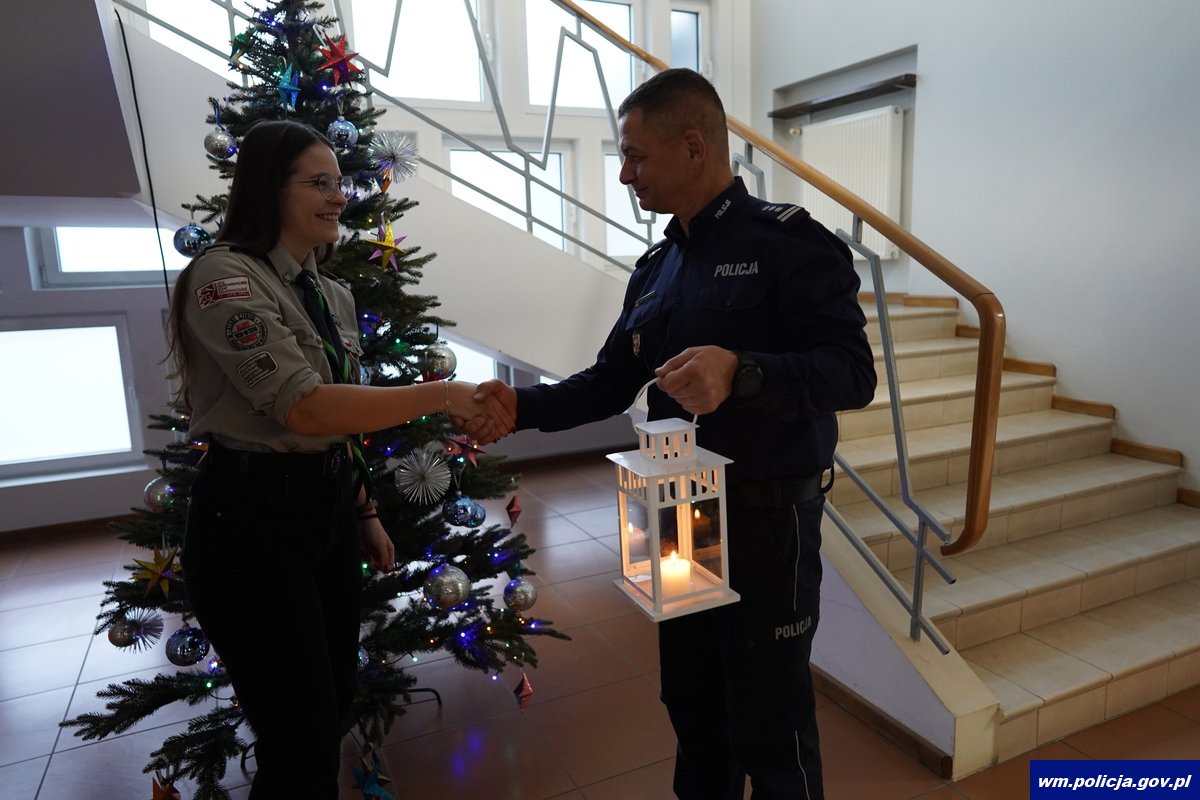 We wtorek (16.12.2025) phm. Justyna Wołoch reprezentująca Związek Harcerstwa Polskiego Chorągiew Warmińsko-Mazurska im. Grunwaldu przekazała na ręce insp. Mirosława Elszkowskiego Komendanta Wojewódzkiego Policji w Olsztynie, dla wszystkich funkcjonariuszy i pracowników garnizonu, Betlejemskie Światło Pokoju. W symbolicznym przekazaniu uczestniczył także insp. Jarosław Brzozowski I Zastępca Komendanta Wojewódzkiego Policji w Olsztynie oraz insp. Radosław Drach Zastępca Komendanta Wojewódzkiego Policji w Olsztynie.
