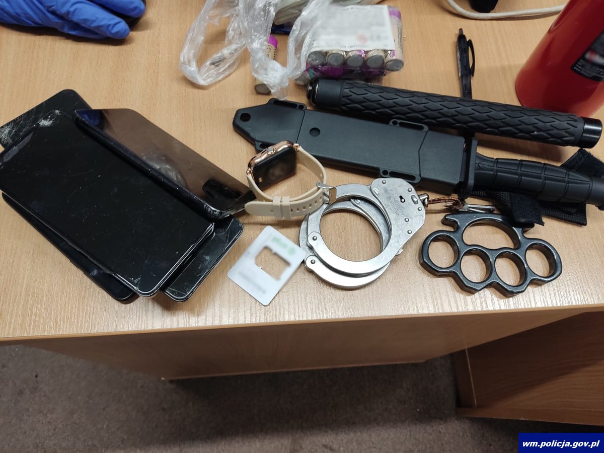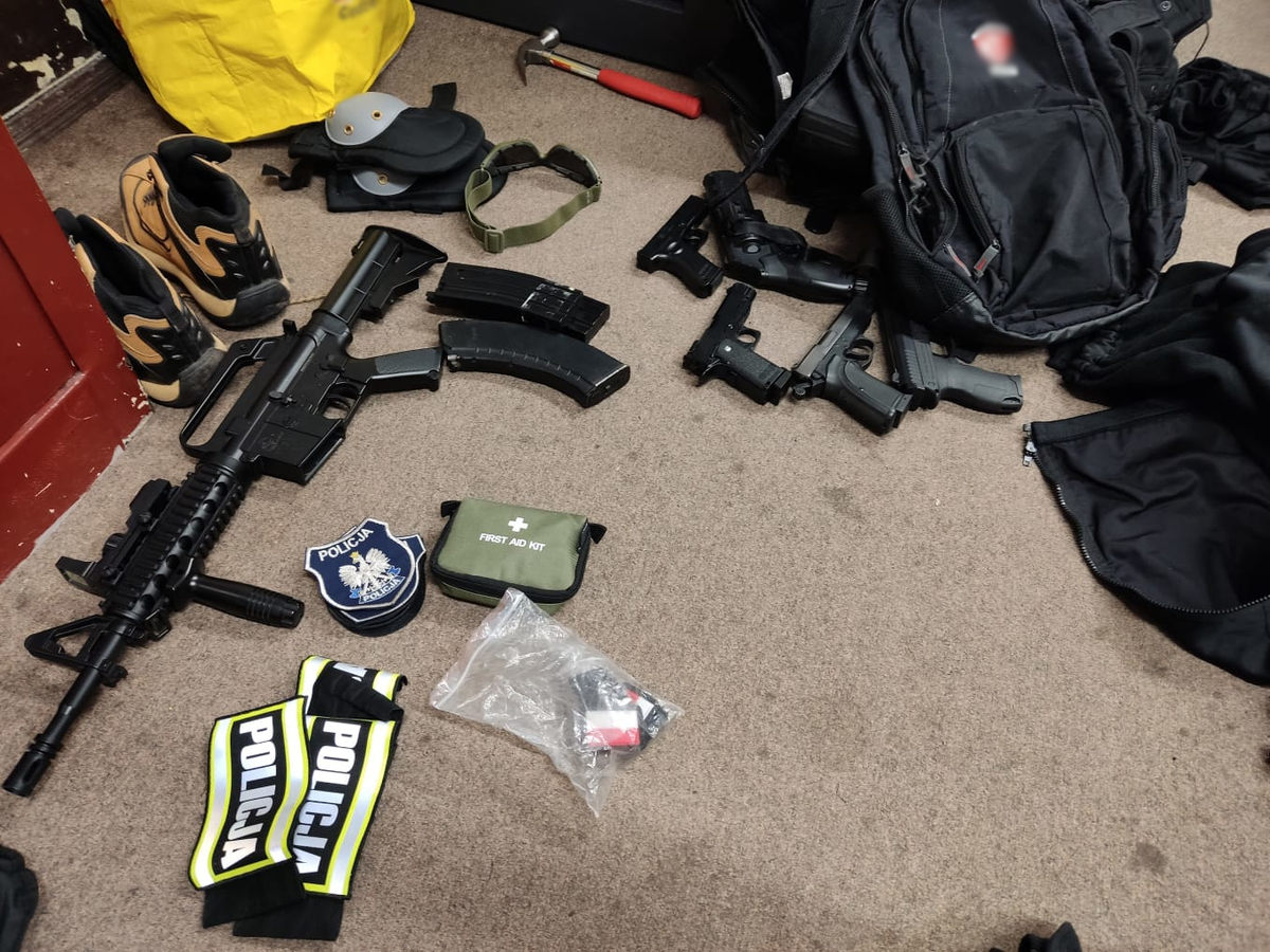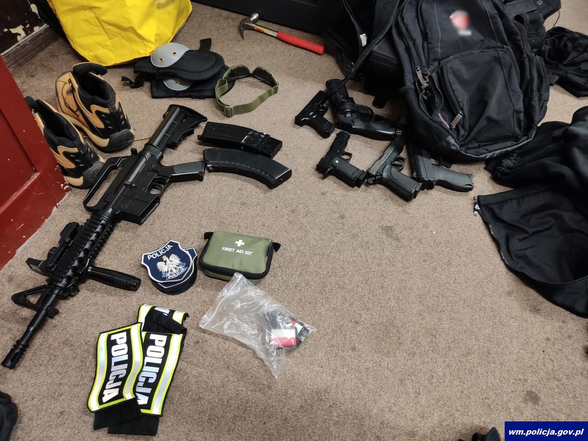 W trakcie zatrzymań zabezpieczone zostały również przedmioty, które mogły posłużyć do popełnienia przestępstwa, takie jak odzież przypominająca mundury, kamizelki taktyczne i naszywki z napisami „Policja”, kajdanki, atrapy broni, pałki, kominiarki, krótkofalówki, elementy odzieży militarnej latarki i ręczne miotacze pieprzu oraz nielegalne środki odurzające, gotówkę i dokumenty tożsamości z danymi innych osób.