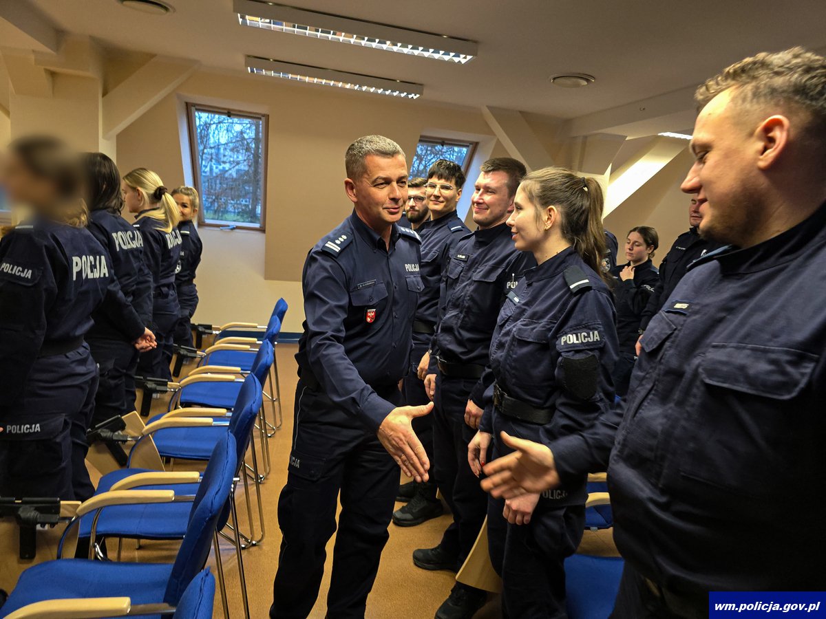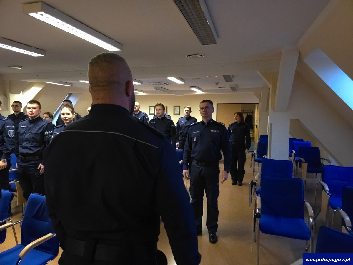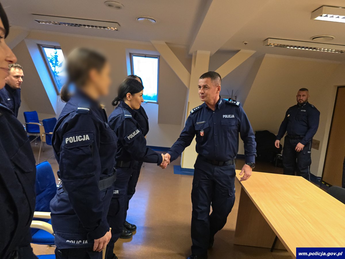 Z gronem funkcjonariuszy z garnizonu warmińsko-mazurskiego w piątek (19.12.2025) na zakończeniu szkolenia spotkał się w obecności kadry szkoleniowej Komendant Wojewódzki Policji w Olsztynie insp. Mirosław Elszkowski. Szef warmińsko-mazurskich policjantów pogratulował funkcjonariuszom zdania egzaminu i jednocześnie życzył kolejnych awansów oraz policyjnego szczęścia na ich ścieżce kariery.