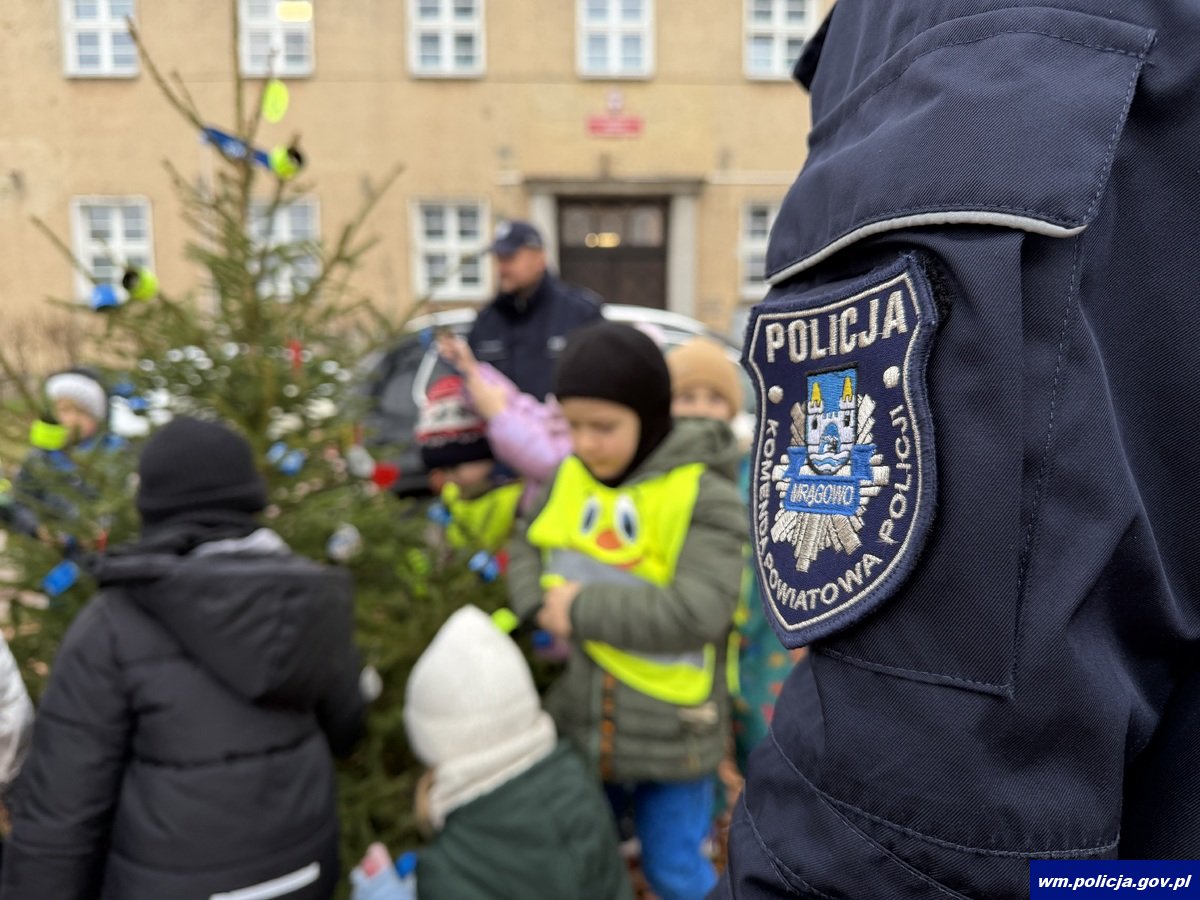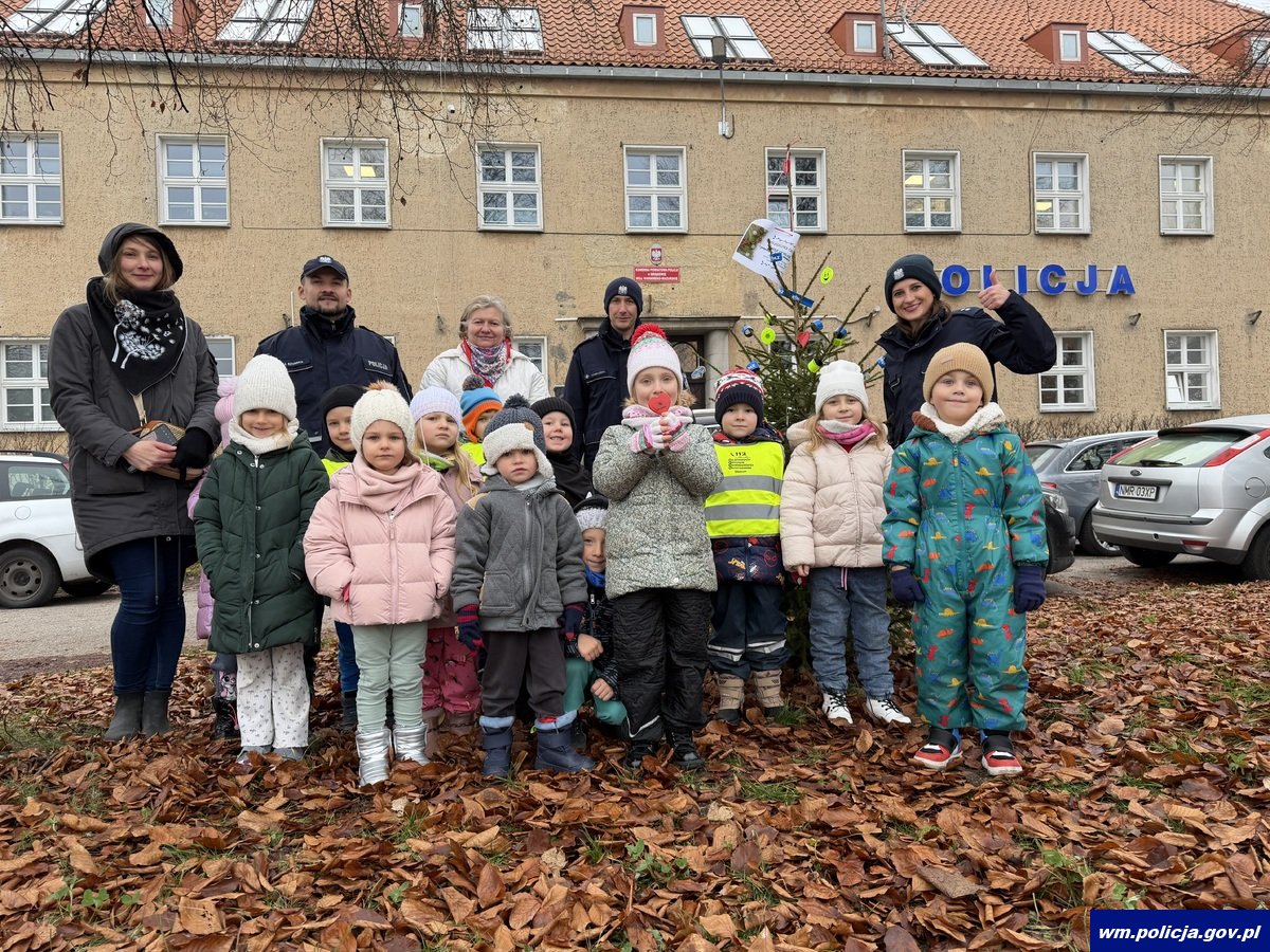 Mrągowscy policjanci doszli do wniosku, że ubieranie choinki w pojedynkę nie daje tyle radości, co wspólne działanie z dziećmi, których uśmiech jest najpiękniejszą ozdobą świąt. Dlatego mrągowskie przedszkolaki miały okazję przybrać świąteczne drzewko w odblaski razem z policjantami. W ten sposób przed budynkiem komendy stanęła odblaskowa choinka, która przez cały dzień przyciągała uwagę mieszkańców, z których każdy mógł bezkarnie zabrać sobie odblask. Z podobnej okazji mogli skorzystać mieszkańcy Rucianego-Nidy, bo tam przed komisariatem również stanęła choinka ubrana w odblaski, przygotowana przez policjantów.