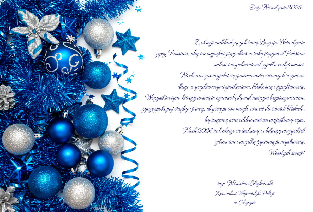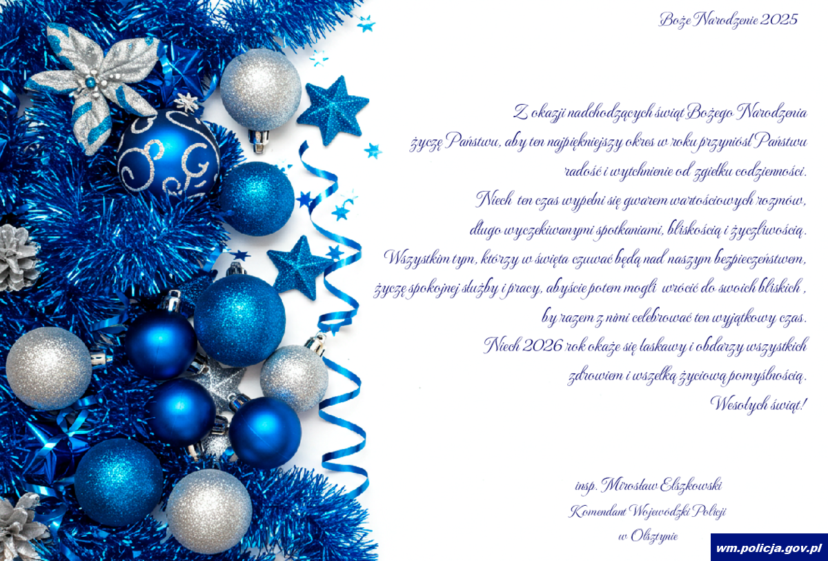 Bożonarodzeniowe i noworoczne życzenia Komendanta Wojewódzkiego Policji w Olsztynie
