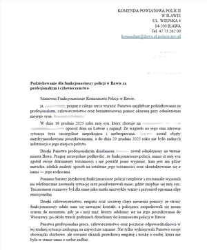 Obywatelka Łotwy postanowiła w sposób szczególny podziękować funkcjonariuszom Komendy Powiatowej Policji w Iławie, pisząc list do Komendanta Powiatowego Policji w Iławie insp. Mirosława Mozarczyka. W liście tym zawarła kilka zdań, w których wyraziła swoją wdzięczność za człowieczeństwo, zrozumienie, a także empatię i chęć niesienia pomocy. Funkcjonariusze pomimo bariery językowej cierpliwie i zrozumiale wyjaśnili zaniepokojonej mamie, gdzie obecnie znajduje się jej syn.