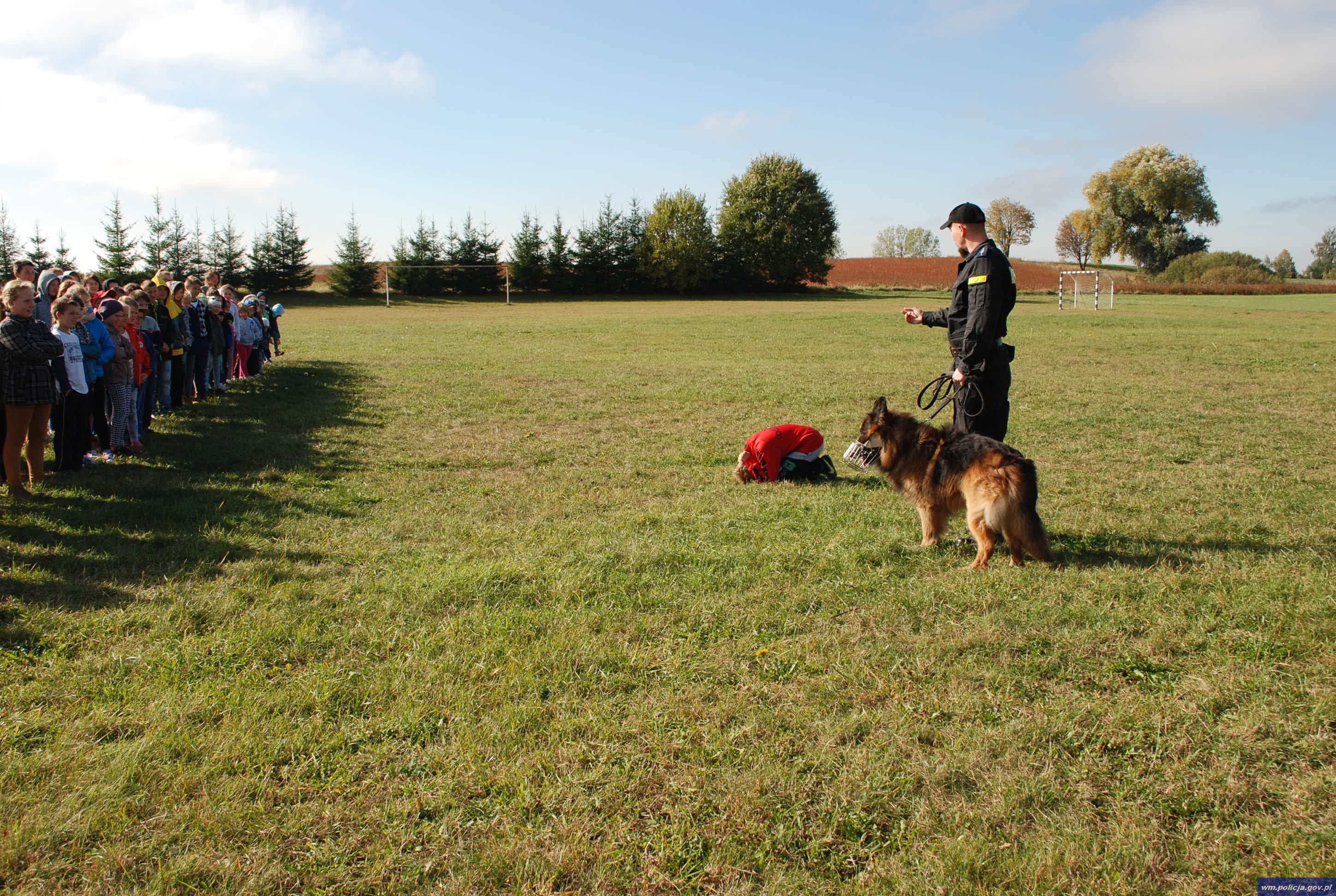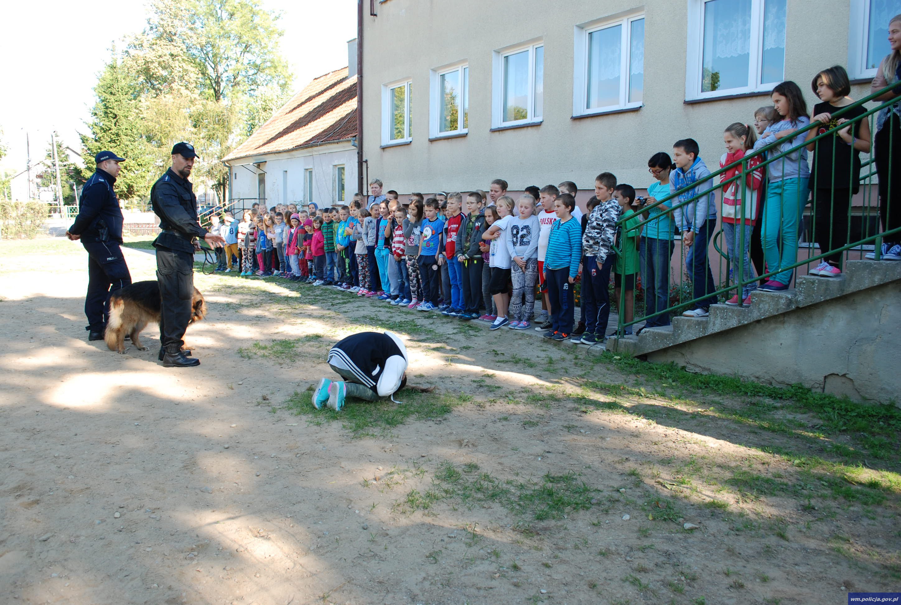 Asp. Łukasz Andrzejewski na co dzień pracujący ze swoim czworonożnym partnerem „Reksem” na początku opowiedział o charakterze pracy przewodnika psa. Następnie przekazał dzieciom wiedzę na temat prawidłowych zachowań w kontakcie z agresywnymi zwierzętami oraz pokazał bezpieczną postawę „żółwia” aby uniknąć pogryzienia.