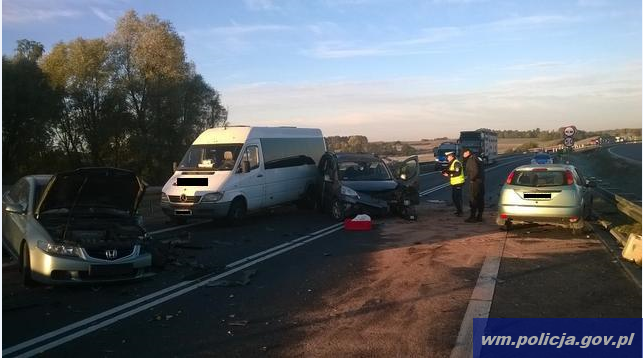 Policjanci wyjaśniają okoliczności wypadku drogowego, do którego doszło około 6 rano na drodze K-16 w okolicy miejscowości Rzeck. Wstępne ustalenia policjantów wskazują, że kierowca forda najechał na tył peugeota, który zatrzymał się w miejscu gdzie remontowana jest droga. Peugeot został wypchnięty na lewy pas ruchu i zderzył się z jadącą z przeciwnej strony mazdą. W zdarzeniu uczestniczył również bus, przewożący pasażerów.