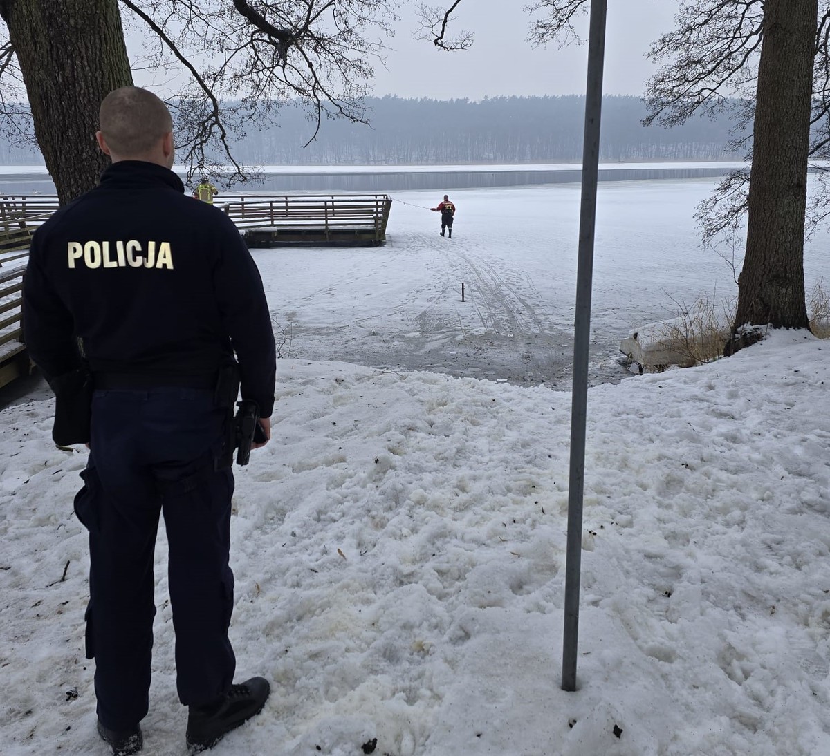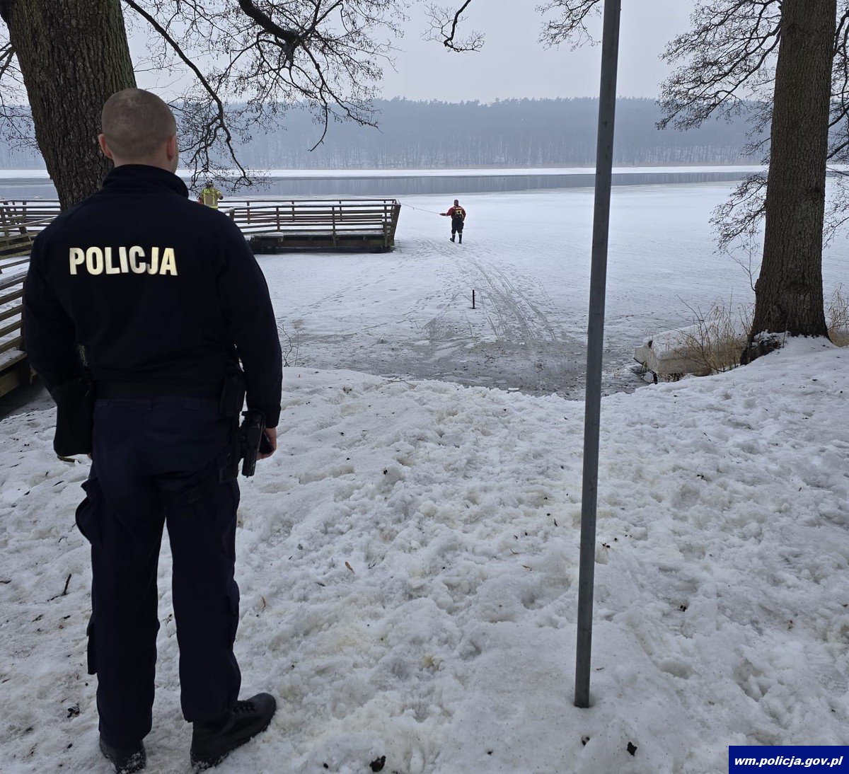 Chciał uratować psa, który wbiegł na lód. Sam potrzebował pomocy. Z pomocą przyjechali policjanci z Komisariatu Policji w Lidzbarku. Mężczyzna, pod którym załamał się lód na jeziorze został uratowany. Jego życiu i życiu psa nie zagraża już niebezpieczeństwo.