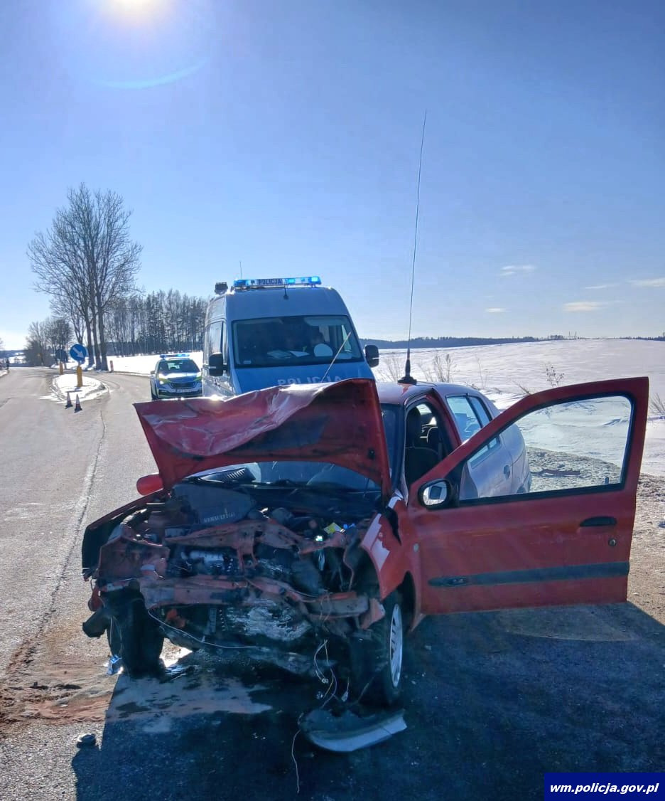 Policjanci pracowali na miejscu wypadku na DK 65 na trasie Ełk-Olecko, do którego doszło w niedzielę (15.02.2026 r.). Ze wstępnych ustaleń wynika, że 86-letni kierujący osobowym renault nie ustąpił pierwszeństwa przejazdu podczas manewru skrętu w lewo, co doprowadziło do zderzenia z osobową toyotą. W wyniku tego kierujący renault oraz pasażerka trafili do szpitala.