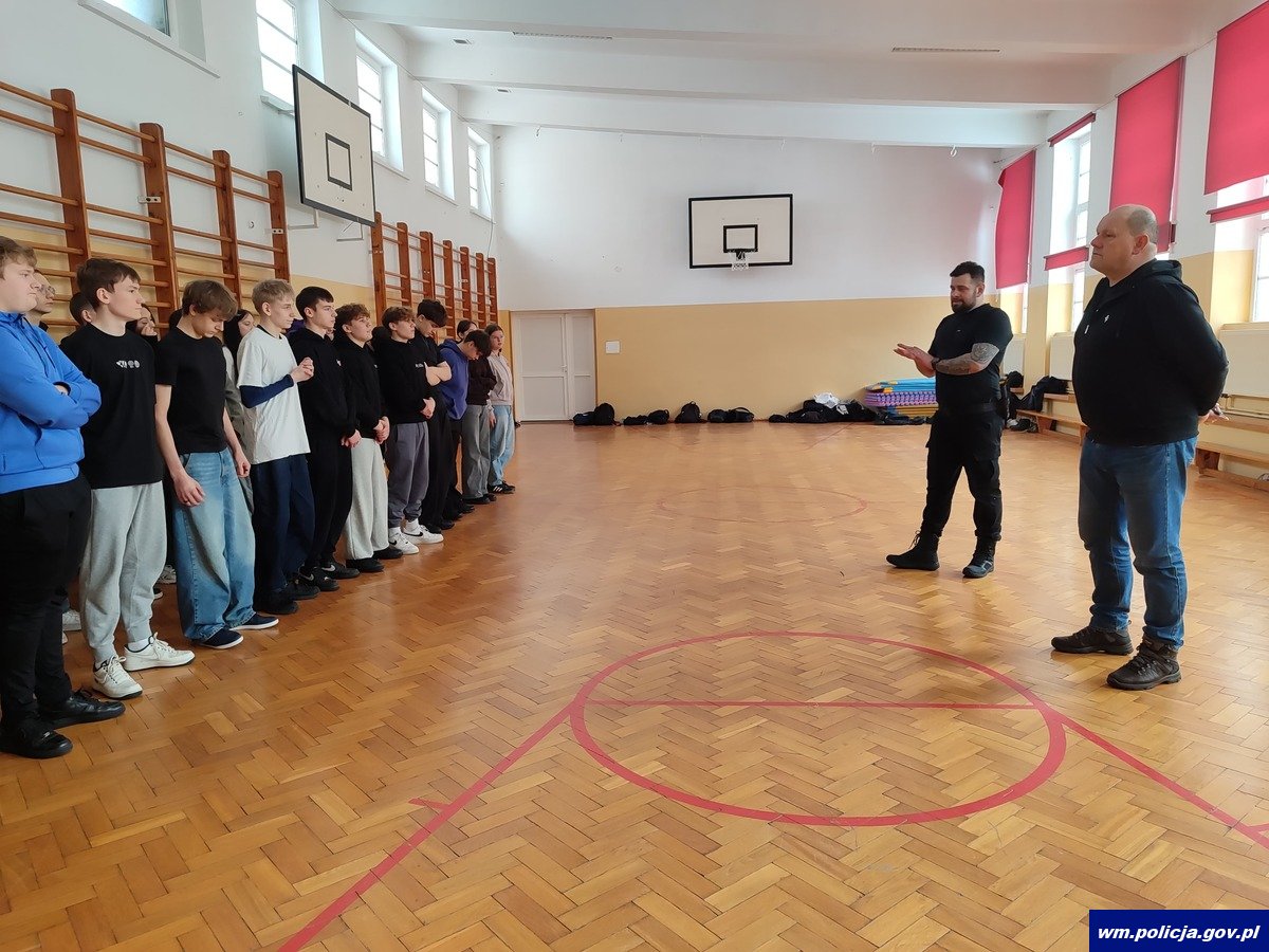 Spotkanie rozpoczęło się od części praktycznej. Instruktor taktyki i technik interwencji przeprowadził zajęcia w formie treningu, podczas którego uczniowie mogli poznać podstawowe elementy działań policyjnych. Młodzież z dużym zaangażowaniem uczestniczyła w ćwiczeniach, sprawdzając swoje umiejętności oraz ucząc się zasad bezpieczeństwa i współpracy w sytuacjach wymagających szybkiej reakcji.