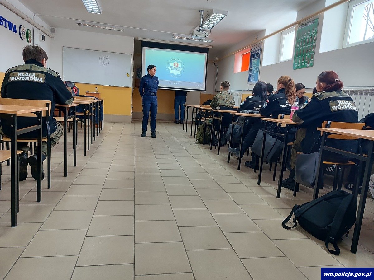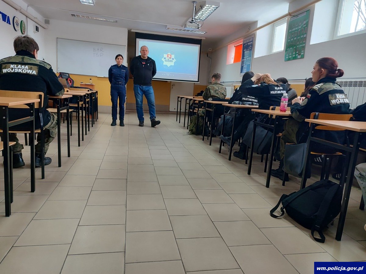 We wtorek (17.02.2026 r.) policjanci przeprowadzili spotkania z młodzieżą uczącą się w klasach mundurowych w Liceum Ogólnokształcącym im. gen. Mariusza Zaruskiego w Węgorzewie. Była to doskonała okazja, aby przybliżyć uczniom charakter pracy funkcjonariuszy Policji, omówić zadania realizowane na co dzień oraz odpowiedzieć na liczne pytania dotyczące przyszłej kariery w służbach mundurowych.
