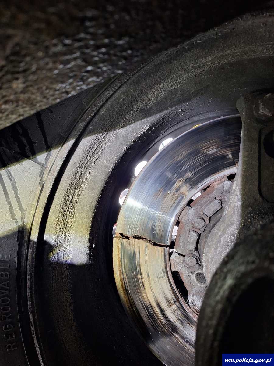 Opony zdarte do cna, popękane tarcze hamulcowe, przekroczony czas pracy kierowcy i tachograf bez wymaganej okresowej legalizacji – taki pojazd nigdy nie powinien znaleźć się na drodze publicznej. Policjanci z olsztyńskiej drogówki zatrzymali dowody rejestracyjne ciągnika i naczepy kontrolowanego przez siebie zestawu ciężarowego. 23-letni kierowca został ukarany mandatem, pracodawca, który zlecił mu kurs będzie się tłumaczył Inspekcji Transportu Drogowego.