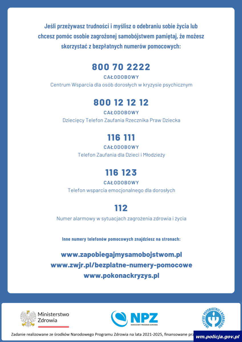 Pamiętajmy! Osoby przeżywające trudności emocjonalne nie są same i mogą szukać wsparcia między innymi na infoliniach organizacji i instytucji zajmujących się pomocą osobom przechodzącym trudne chwile. Pomocy na terenie całego kraju można szukać, dzwoniąc pod numer alarmowy 112 lub Kryzysowy Telefon Zaufania pod nr 116 123 i Młodzieżowy Telefon Zaufania 116 111.