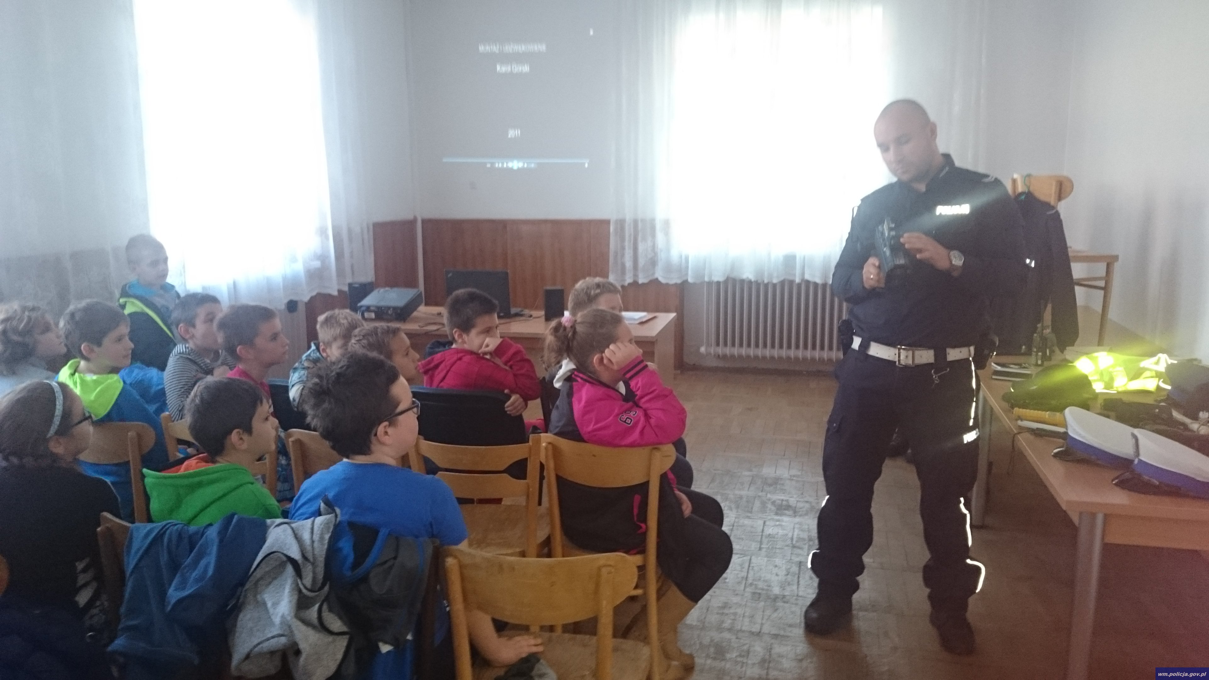 Policjanci w trakcie codziennej służby znajdują czas by spotkać się dziećmi ze szkół podstawowych, po to by przekazać im najważniejsze zasady bezpieczeństwa w ruchu drogowym.
