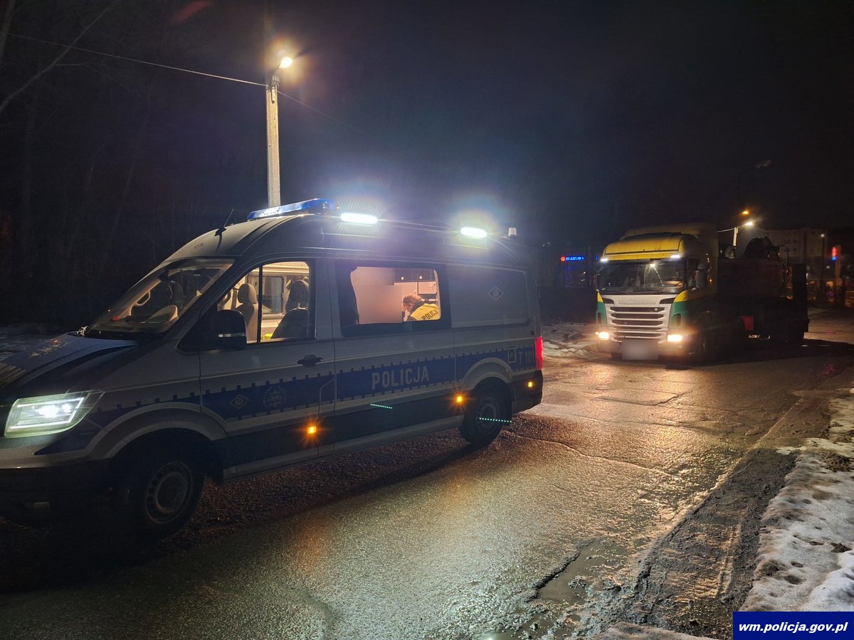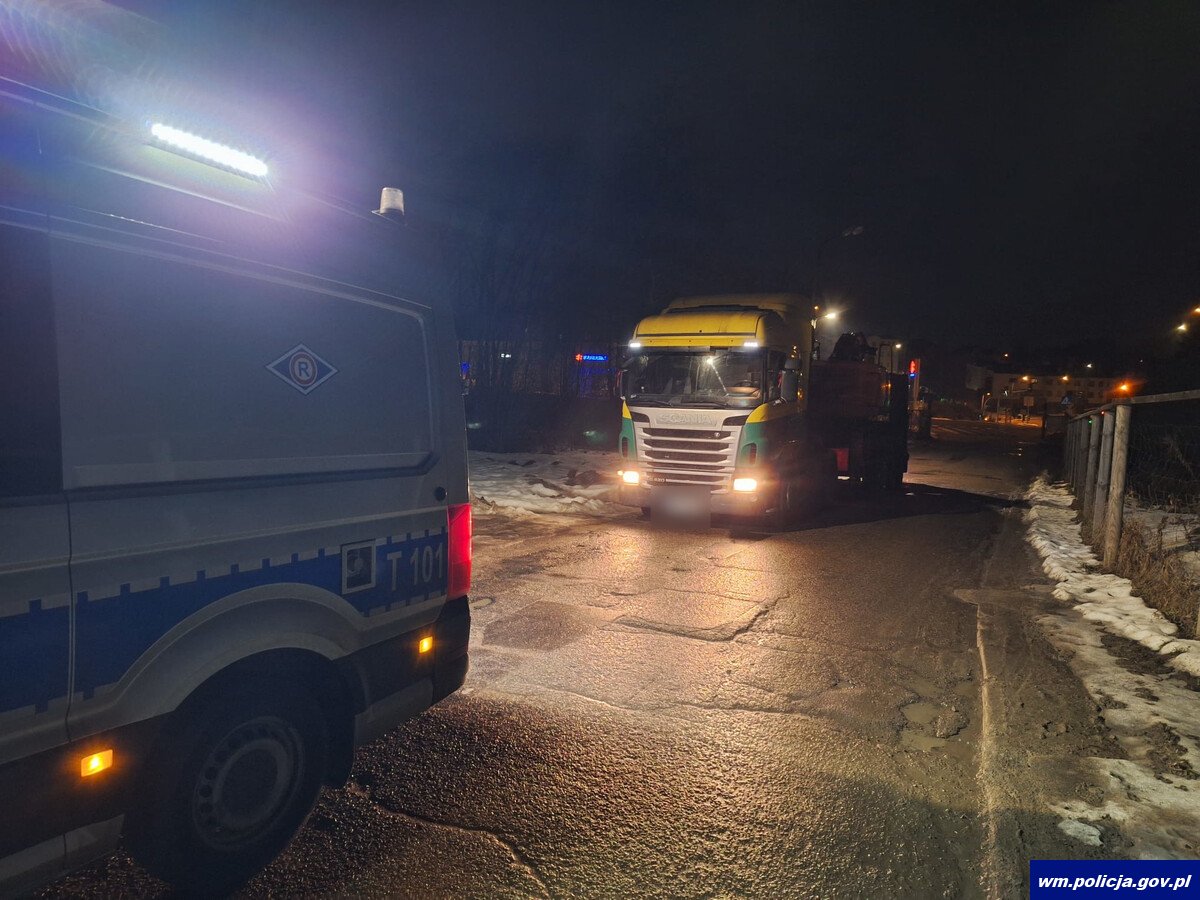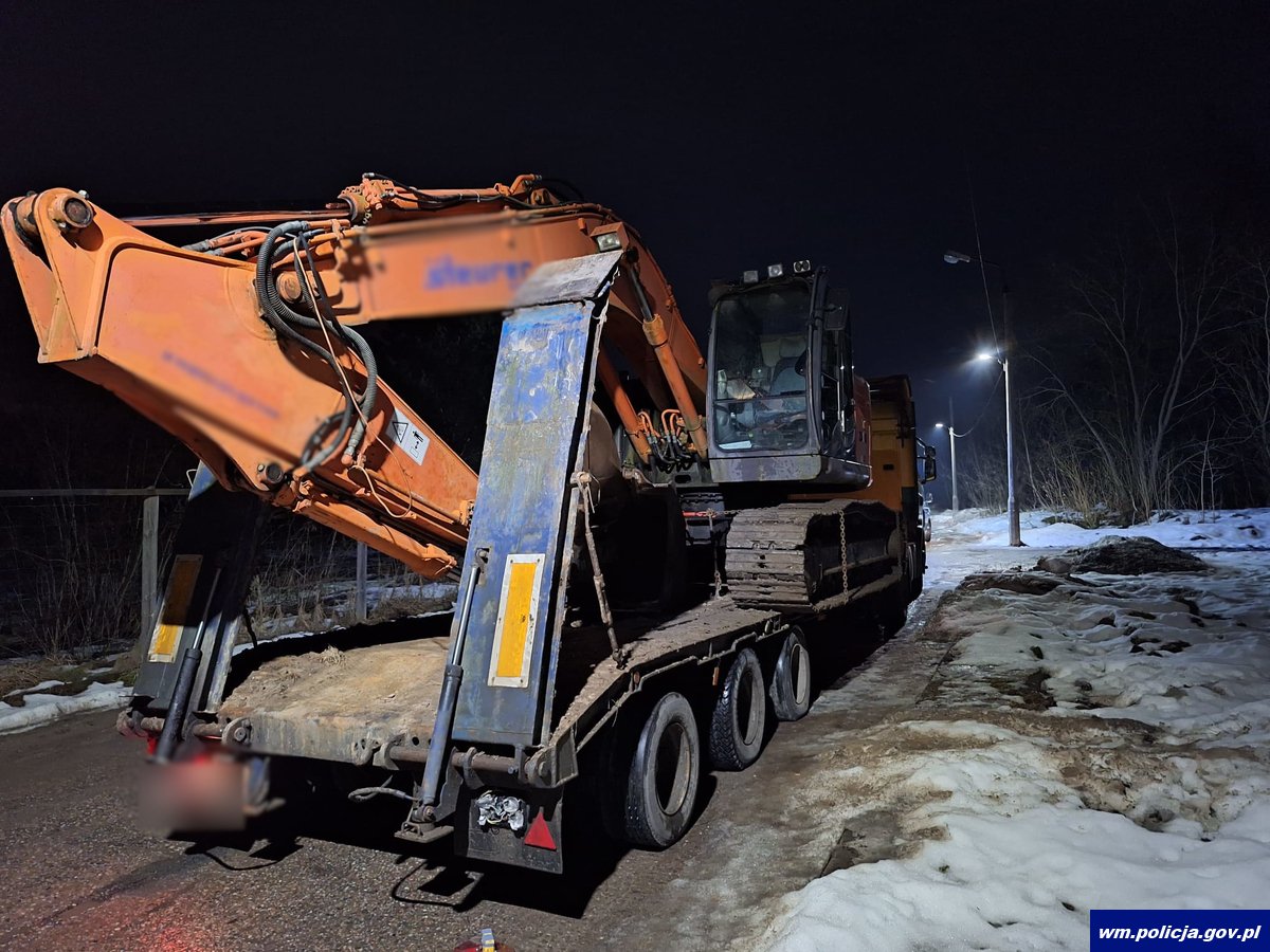 W poniedziałek (02.03.2026 r.) po godzinie 01:00 w nocy zauważyli jadący aleją Sikorskiego w Olsztynie zestaw ciężarowy z koparką ustawioną na naczepie. Policjanci zwrócili uwagę na to, że ciągnik miał uszkodzone światła i pękniętą przednią szybę. Poza tym ładunek istotnie wystawał poza obrys naczepy i nie był odpowiednio oznaczony.