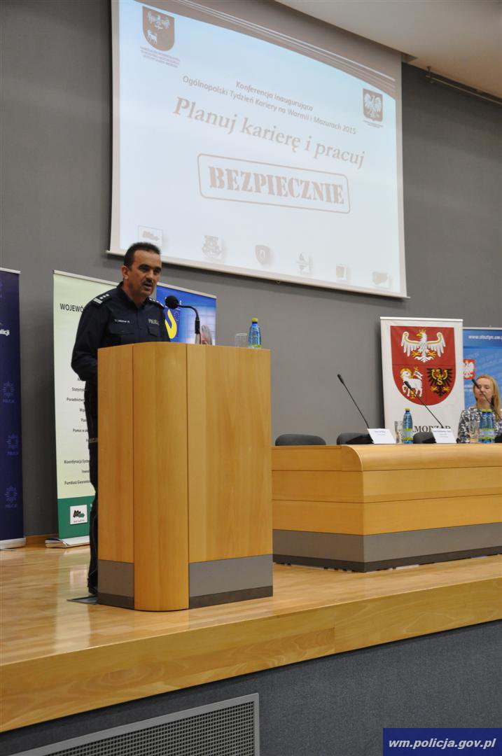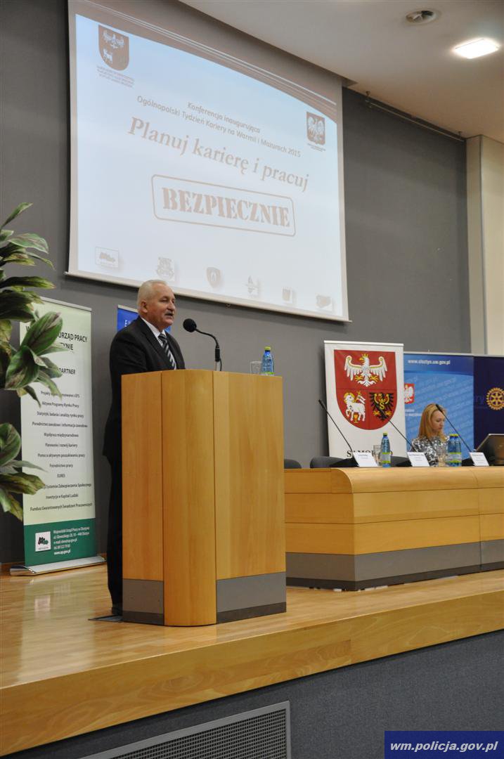 W Warmińsko-Mazurskim Urzędzie Wojewódzkim odbyła się konferencja „Planuj karierę i pracuj bezpiecznie” inaugurująca Ogólnopolski Tydzień Kariery na Warmii i Mazurach. Organizatorami spotkania były Komenda Wojewódzka i Miejska Policji w Olsztynie, Wojewódzki Urząd Pracy w Olsztynie oraz Starostwo Olsztyńskie. Honorowy Patronat nad wydarzeniem objęli Marszałek Województwa Warmińsko – Mazurskiego Gustaw Marek Brzezin oraz Wojewoda Warmińsko – Mazurski Marian Podziewski.