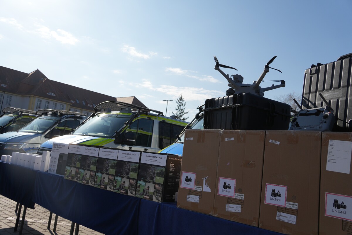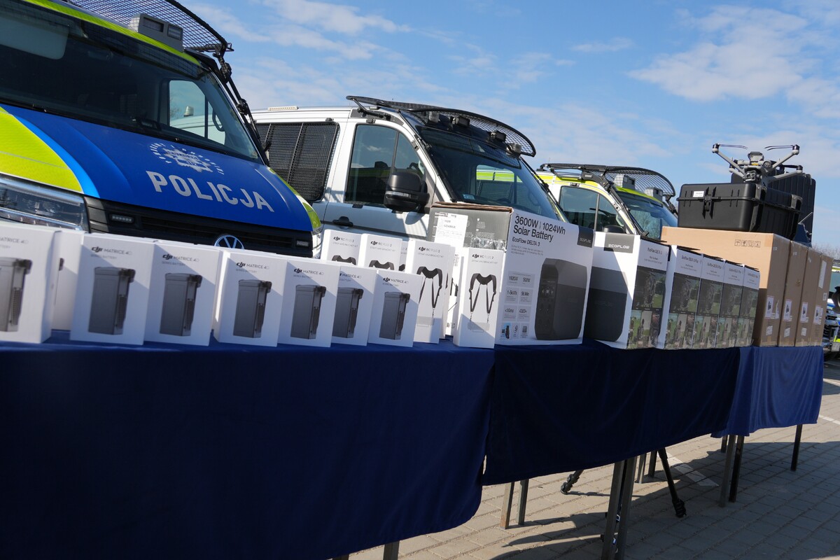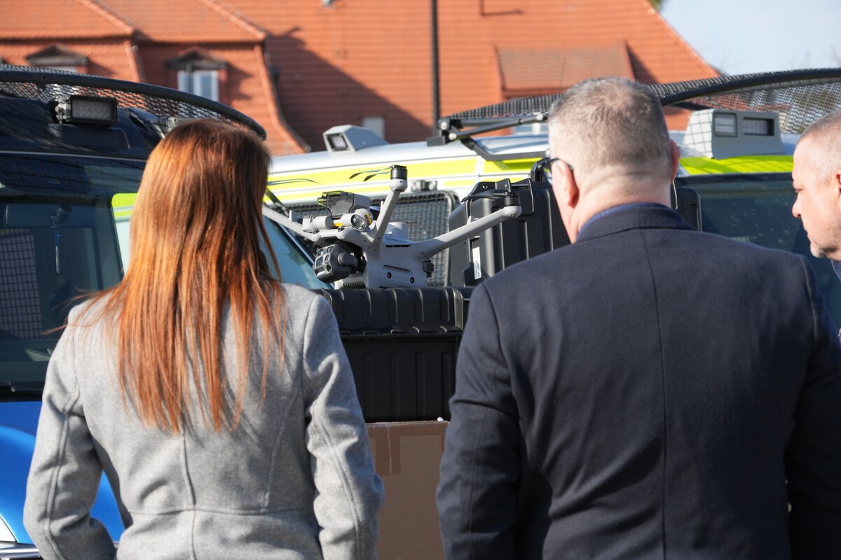 W poniedziałek (23.03.2026 r.) dzięki porozumieniu, do policjantów z Warmii i Mazur trafiło 6 dronów DJI Matrice 4TD wraz z osprzętem, o łącznej wartości ponad 214 tys. zł. Zakupione BSP zostały zaprezentowane na terenie Oddziału Prewencji Policji w Olsztynie w obecności Radosława Króla Wojewody Warmińsko-Mazurskiego, insp. Mirosława Elszkowskiego Komendanta Wojewódzkiego Policji w Olsztynie, insp. Jarosława Brzozowskiego I Zastępcy Komendanta Wojewódzkiego Policji w Olsztynie oraz mł. insp. Marcina Romanowa Naczelnika Wydziału Zaopatrzenia KWP w Olsztynie.
