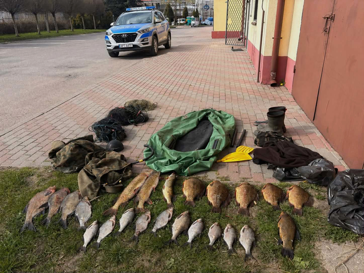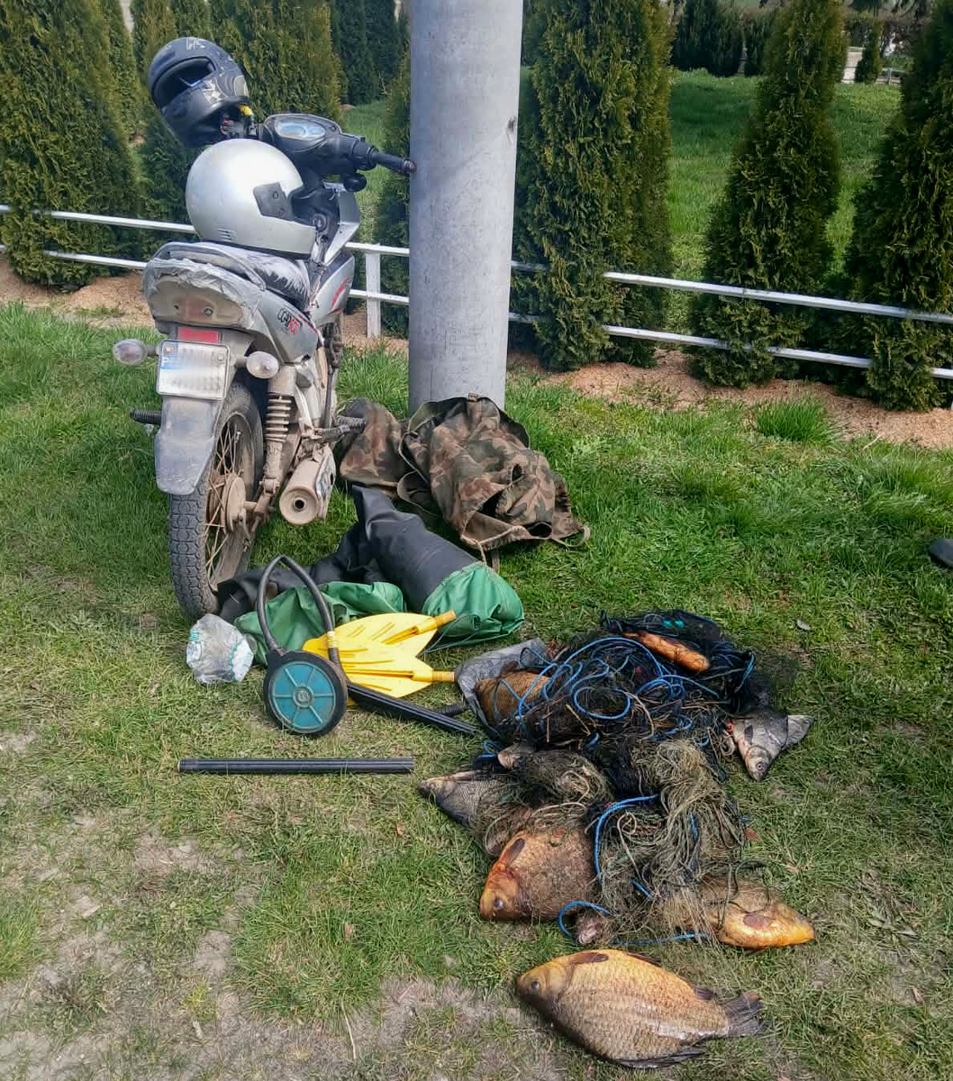 W piątek (17.04.2026 r.) kilka minut po godzinie 14:00 funkcjonariusze z Posterunku Policji w Kisielicach zatrzymali do kontroli kierującego motorowerem. Policjanci wylegitymowali mężczyznę, sprawdzili w policyjnych systemach oraz skontrolowali stan trzeźwości. Okazało się, że kierowca był trzeźwy, ale pasażer był pod działaniem alkoholu. Funkcjonariusze sprawdzili również plecaki, które posiadali mężczyźni. A w środku ujawnili, ryby zaplątane w sieci, zwinięte i schowane w plecaku, oraz ponton, pompkę i składane wiosła. Na miejsce wezwano funkcjonariuszy Straży Rybackiej, którzy wykonali swoje czynności. Okazało się, że na akwenie Jeziora Goryńskiego w gminie Kisielice, 58-latek wspólnie ze swoim 31-letnim synem, dokonywali nielegalnego połowu ryb przy użyciu sieci typu wonton. Jak ustalili policjanci, to nie było jedyne przewinienie starszego z mężczyzn, gdyż mieszkaniec gminy Kisielice przewoził swojego nietrzeźwego syna motorowerem, za co został ukarany mandatem w wysokości 500 zł.
