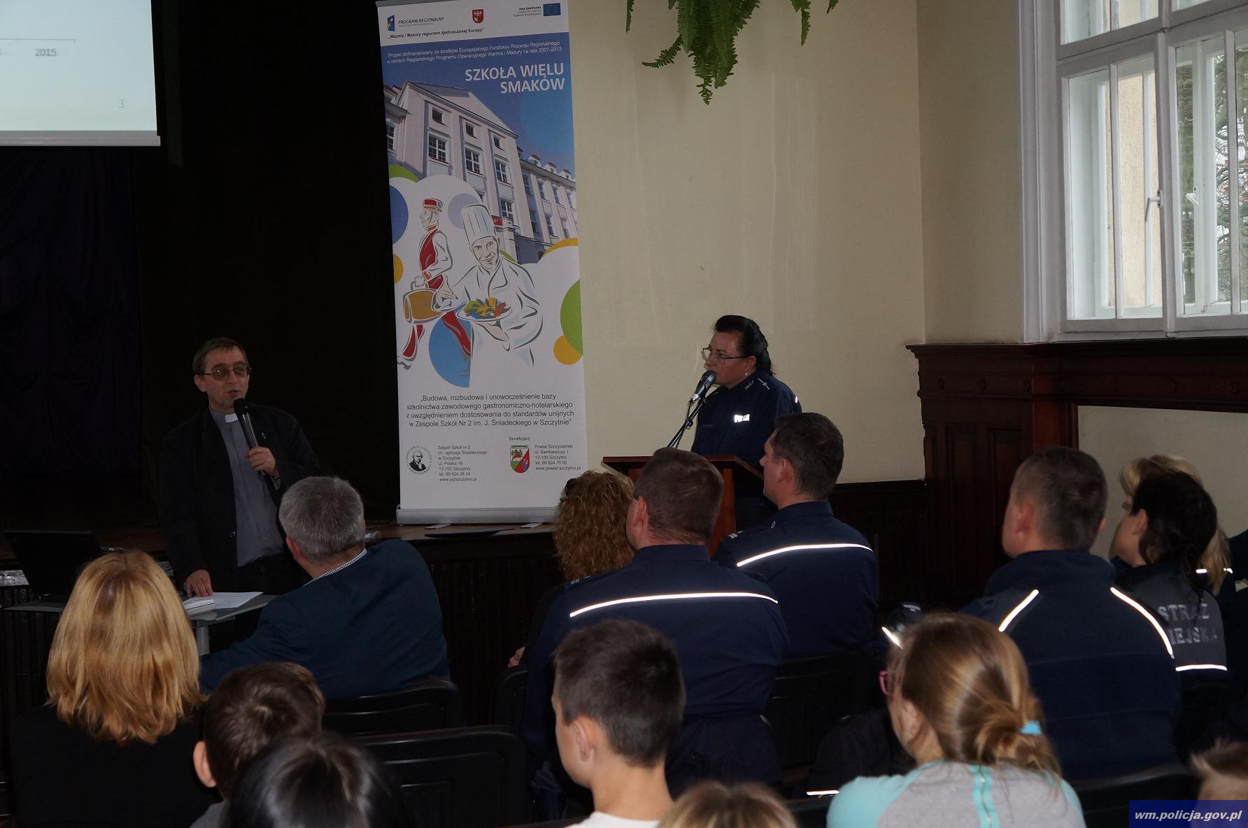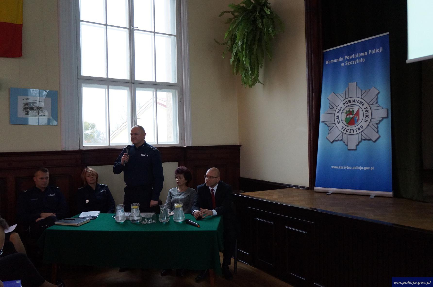 Podinsp. Tomasz Michalczak I Zastępca Komendanta Powiatowego Policji w Szczytnie przedstawił problematykę działania Policji w zakresie ujawniania nieletnich zagrożonych demoralizacją oraz formy przeciwdziałania zjawiskom na przykładzie działań szczycieńskiej jednostki Policji.