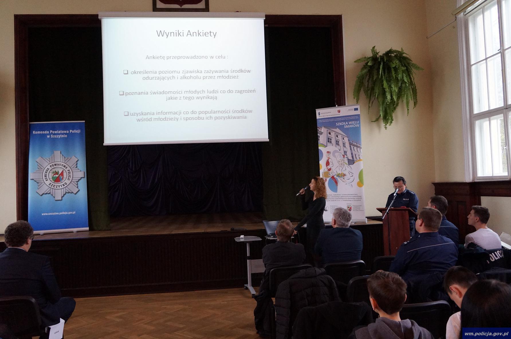 Aleksandra Fila - pedagog szkolny z Zespołu Szkół nr 1 w Szczytnie zaprezentowała wyniki ankiety przeprowadzonej wśród uczniów szkół gimnazjów oraz ponadgimnazjalnych z terenu powiatu szczycieńskiego na temat „Doświadczenia młodzieży z zakresu zażywania środków odurzających i spożywania alkoholu”.