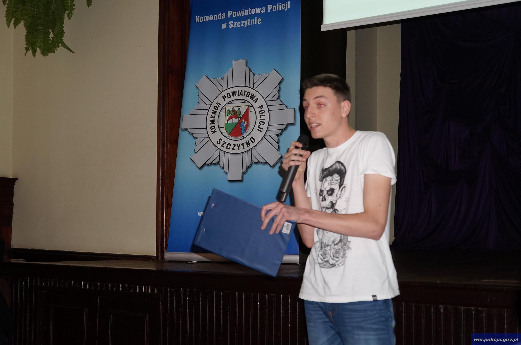 Uczeń z Zespołu Szkół nr 2 w Szczytnie - Krzysztof Berendt - zaprezentował monodram „Kartka” – przybliżając problem dilowania i konsekwencji prawnych i moralnych jakie to za sobą niesie.