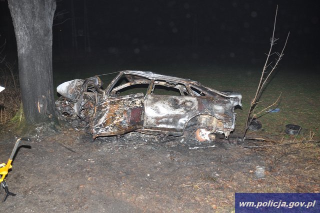 Okazało sie, że w samochodzie był również pasażer, którego niestety nie udało się uratować. Na miejscu wypadku przez kilka godzin wraz z policjantami i prokuratorem pracował biegły z zakresu wypadków drogowych. Wstępnie ustalono, że 24-letni kierowca, na prostym odcinku drogi prawą stroną samochodu uderzył w przydrożne drzewo, przez co stracił panowanie nad mazdą, a następnie po przejechaniu kilkudziesięciu metrów, zjechał do rowu i uderzył w kolejne drzewo. Samochód uległ całkowitemu spaleniu. 24-letni kierowca z poważnymi obrażeniami ciała trafił do szpitala w Olsztynie. Tam pobrano mu krew do badań, by ustalić, czy nie znajdował się pod działaniem alkoholu. Ciało pasażera zabezpieczono w morąskim prosektorium.