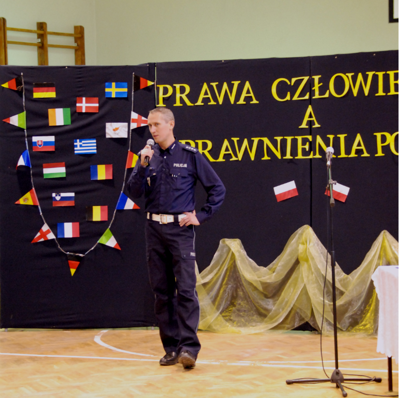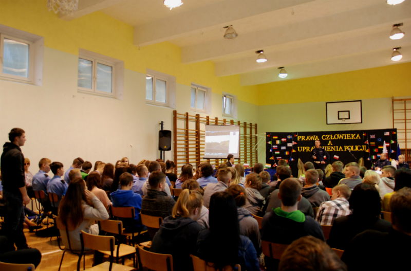 Spotkanie rozpoczęło się od krótkiego wystąpienia przedstawiciela klasy policyjnej z ZSLZ i przypomnienia o ustanowionym na dzień 10 grudnia Międzynarodowym Dniu Praw Człowieka. Następnie Zbigniew Stefanowski – nauczyciel z LO przedstawił rys historyczny powstania i okoliczności podsiania Powszechnej Deklaracji Praw Człowieka.