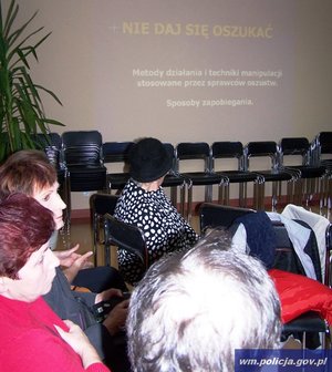Kolejnym tematem dyskusji były przestępstwa metodą „na wnuczka” i „na policjanta”. Naczelnik Wydziału Prewencji i Ruchu Drogowego podinsp. Adam Borowski przedstawił i opisał sposoby działania przestępców parających się tymi metodami. Wskazał na kluczowe elementy, słowa i zwroty, którymi posługują się oszuści, aby wzbudzić zaufanie potencjalnych ofiar i utwierdzić je w przekonaniu, że rozmawiają z osobą z rodziny. Wszystko po to, by wyłudzić od nich pieniądze. Ponadto omówił, na co zwracać uwagę przy takiej rozmowie i jak postępować, aby ustrzec się przed utratą, niejednokrotnie, oszczędności całego życia.