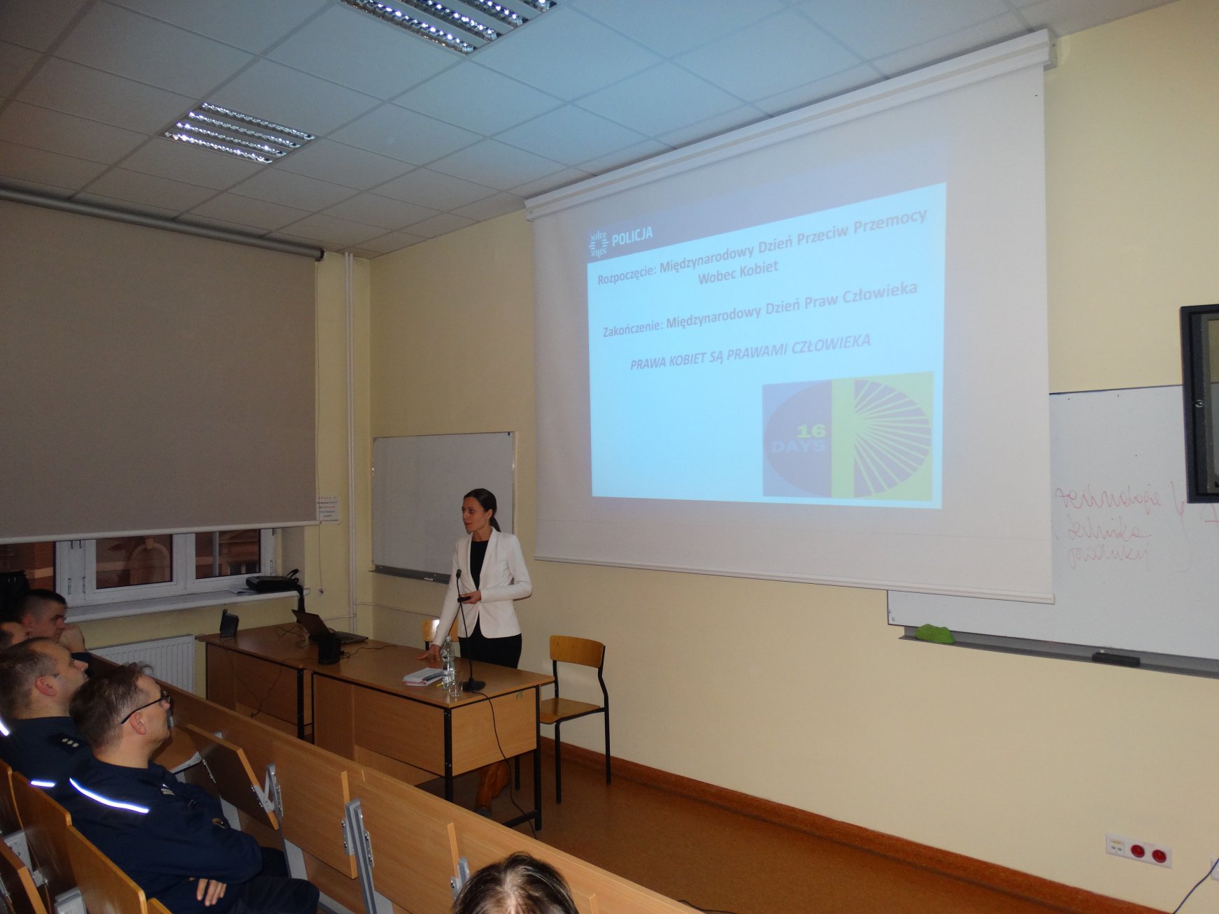 Kom. Aneta Jurkiewicz p.o. Naczelnika Wydziału Prewencji z iławskiej komendy policji omówiła zagadnienia dotyczące praw i wolności człowieka w kontekście zadań realizowanych przez policję. Odpowiedziała na pytania: Czy uprawnienia policji stanowią ingerencję w prawa człowieka? oraz czy uprawnienia policji naruszają prawa człowieka? Omówiła także użycie środków przymusu bezpośredniego i broni palnej w kontekście przestrzegania praw człowieka. Natomiast nadkom. Sławomir Kołpacki Naczelnik Ruchu Drogowego iławskiej policji przedstawił uprawnienia policji podczas kontroli drogowej. Omówił jakie prawa i obowiązki ma kontrolowany uczestnik ruchu drogowego, kiedy można zatrzymać mu prawo jazdy bądź dowód rejestracyjny.