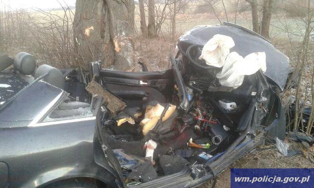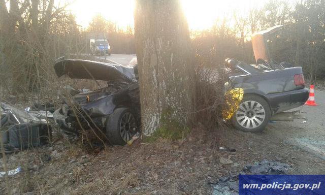 Wstępne ustalenia drogówki wskazują na to, że kierujący Audi jadąc drogą wojewódzką 593 na łuku drogi stracił panowanie nad pojazdem, wpadł w poślizg i lewym bokiem uderzył w przydrożne drzewo. Samochodem podróżowało pięciu młodych mężczyzn w wieku od 19 do 23 lat. Wszyscy trafili do szpitala. Stan czwórki jest bardzo ciężki.