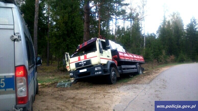W poniedziałek około godziny 17.00 oficer dyżurny szczycieńskiej komendy otrzymał telefoniczne zgłoszenie o zdarzeniu drogowym z udziałem samochodu ciężarowego. Na miejsce natychmiast pojechali policjanci ruchu drogowego. Z ustaleń funkcjonariuszy wynika, że najprawdopodobniej 32-letni kierowca nie dostosował prędkości do panujących warunków na drodze. Mężczyzna wykonując manewr wymijania zjechał na prawe pobocze i zatrzymał się na przydrożnym drzewie. Przewożone na naczepie pustaki rozsypały się w lesie. Towar nie stwarzał zagrożenia dla pozostałych uczestników ruchu w związku z tym droga była przejezdna. Zaistniałe zdarzenie drogowe wyglądało na dość groźne jednak kierowca Mana nie doznał żadnych obrażeń ciała. 32-latek był trzeźwy.