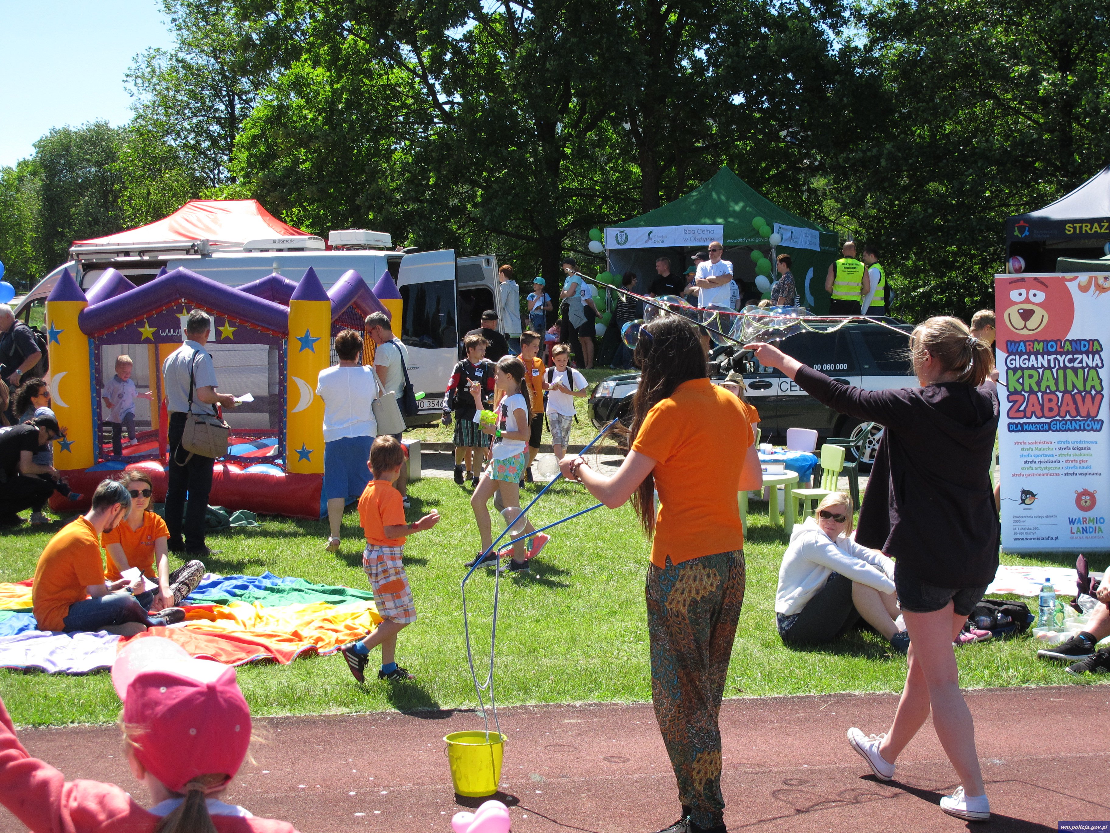 Przygotowane zostały stanowiska wraz ze sprzętem wykorzystywanym w pracy przez służby mundurowe z Olsztyna. Każde dziecko mogło wejść do radiowozu, zajrzeć do karetki pogotowia ratunkowego, wozu strażackiego, więźniarki do przewożenia skazanych czy też samochodu celników z tzw. rentgenem. Uczestnicy festynu mogli zobaczyć i przymierzyć czapki służbowe policjantów z całego świata. Policjanci z Wydziału Ruchu Drogowego KWP w Olsztynie przygotowali dla dzieci rowerowy tor przeszkód. Udzielali również poraz z zakresu bezpieczeństwa w ruchu drogowego.