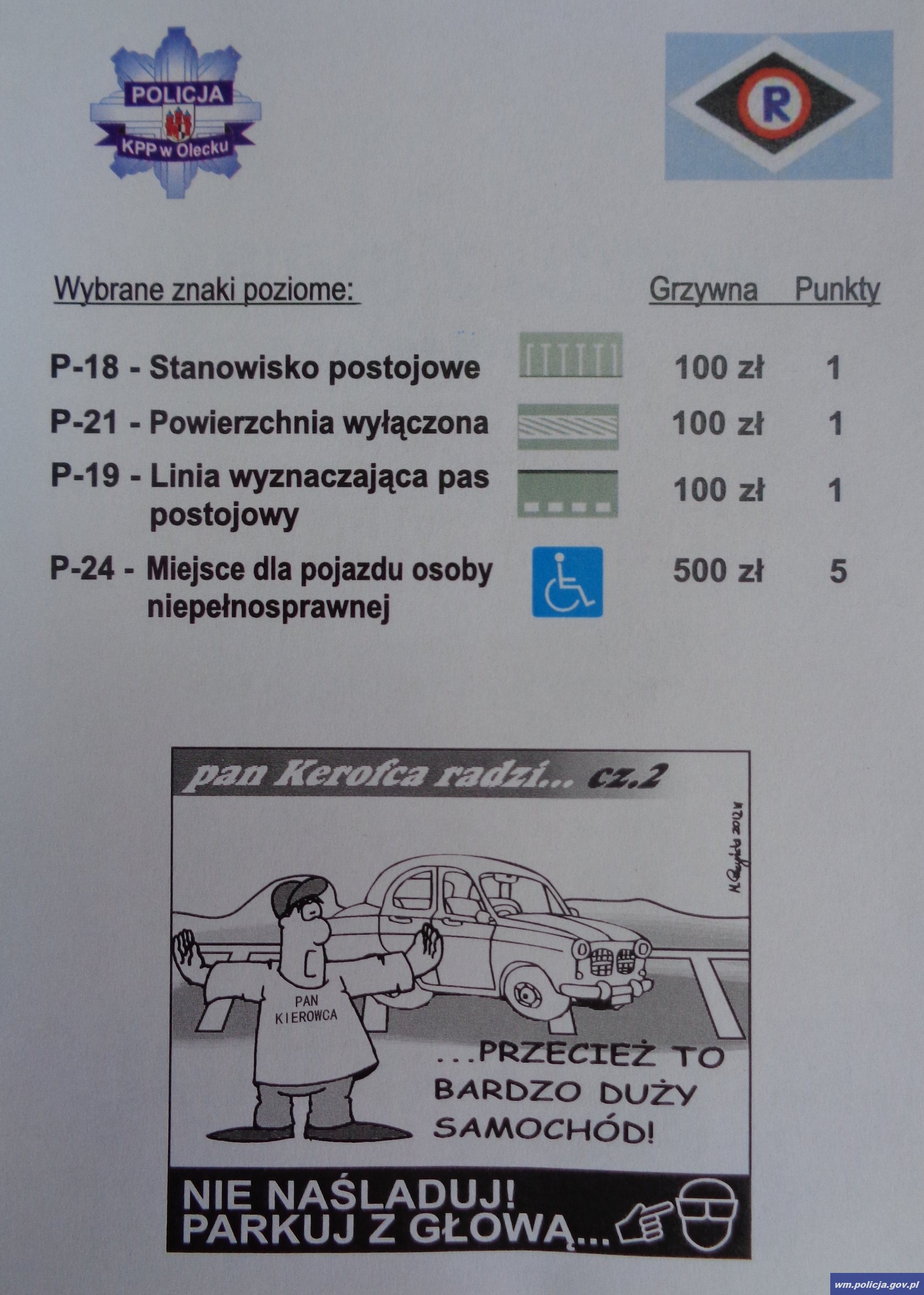 Oleccy policjanci wspólnie z uczniami II klasy LO o profilu policyjno – pożarniczym przeprowadzili kolejną już akcję profilaktyczno - edukacyjną "Parkuj z głową – zero tolerancji". Kierowcy, którzy nie przestrzegali znaków poziomych, znajdowali za wycieraczką swoich samochodów specjalną ulotkę. Wszystko po to, aby zwiększyć liczbę miejsc parkingowych w centrum miasta i uświadomić konieczność stosowania się do znaków drogowych.