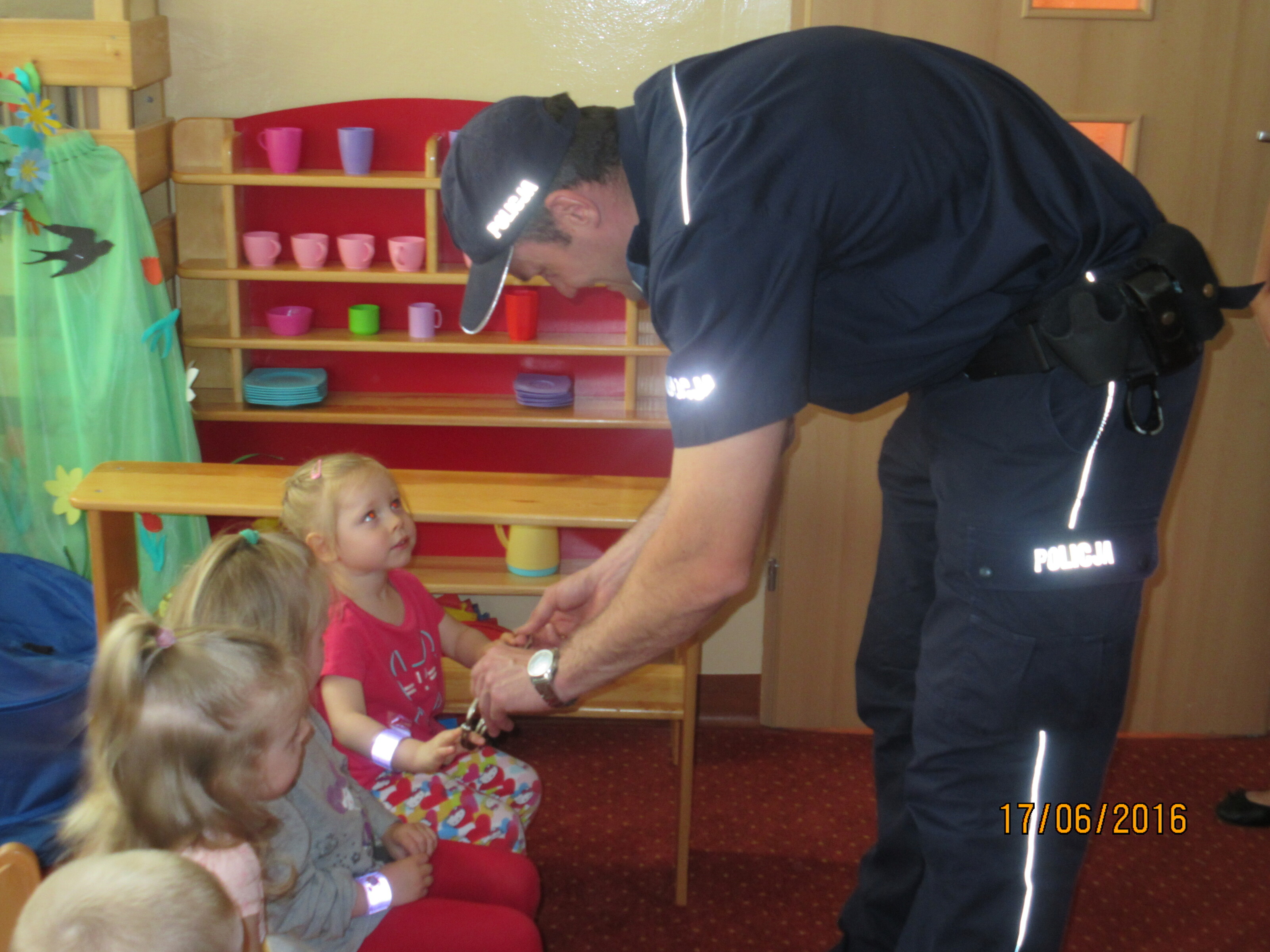 Żłobek odwiedzili przedstawiciele Komendy Miejskiej Policji w Olsztynie - dzielnicowy i pracownik cywilny komórki ds. nieletnich w Wydziale Prewencji. Dla większości dwulatków była to pierwsza okazja, by zobaczyć policjanta z bliska i w dodatku móc z nim porozmawiać. Podczas spotkania dzieci obejrzały poszczególne elementy umundurowania i uczyły się ich nazw. Sprawdzały, czym różni się czapka z daszkiem, którą noszą dzieci, od tej na głowie policjanta. Przyglądały się z daleka, co policjant nosi na pasie, ucząc się, że są to bardzo niebezpieczne przedmioty, używane tylko, gdy policjantowi grozi niebezpieczeństwo. Dzieci dowiedziały się, jakie zadania ma do wykonania policjant i same dodały, że jest on potrzebny, gdy ktoś ukradnie mamie torebkę lub jeździ samochodem bez zapiętych pasów.