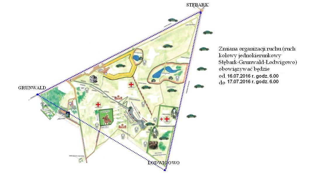 Jak w latach ubiegłych, na trasie Grunwald – Łodwigowo – Stębark – Grunwald będzie obowiązywał ruch jednokierunkowy. Będą informowały o tym tablice ustawione w tych miejscowościach. Przy tej trasie zlokalizowana jest większość parkingów - głównie w okolicy Pól Grunwaldu, ale także w miejscowości Stębark.