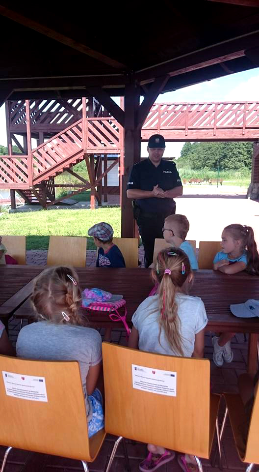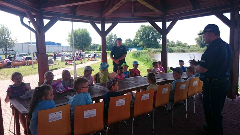 Spotkanie i wspólna zabawa były okazją do przypomnienia co robimy w chwili zagrożenia, które mogą na nas czyhać podczas letniego wypoczynku. Policjanci Posterunku Policji w Zalewie - st. asp. Mariusz Skonieczny wspólnie z asp. Marcinem Pakieła - spotkali się z dziećmi podczas półkolonii odbywających się w Ekomarinie w Zalewie.