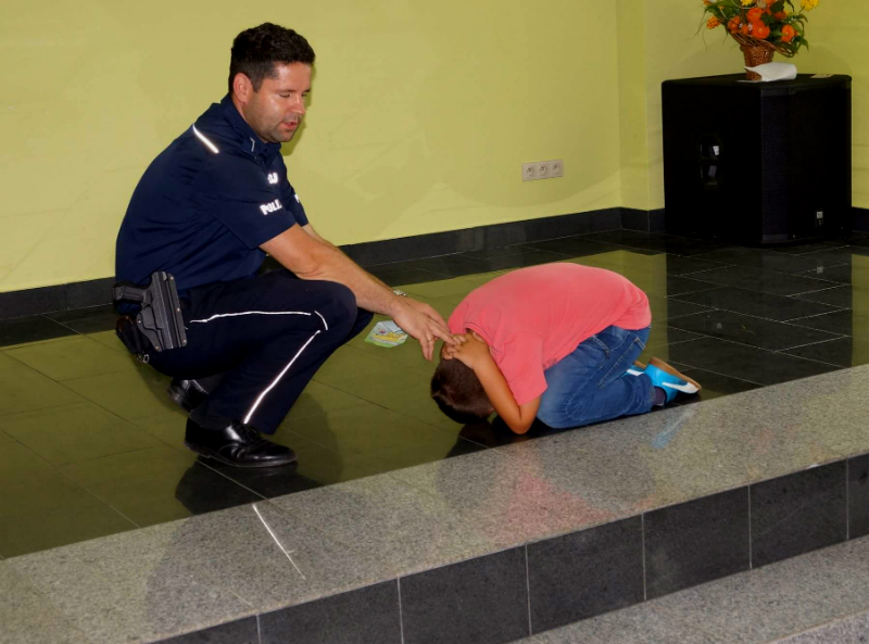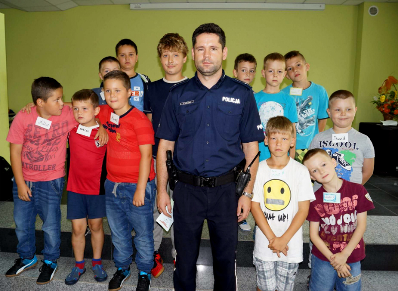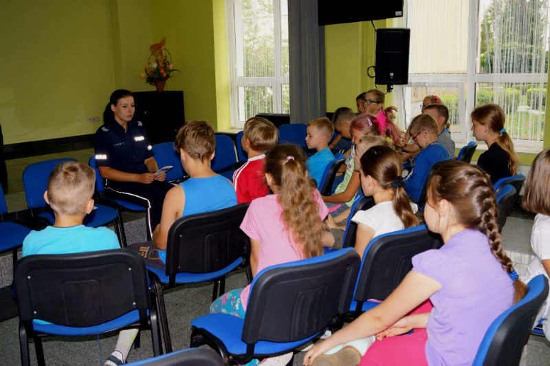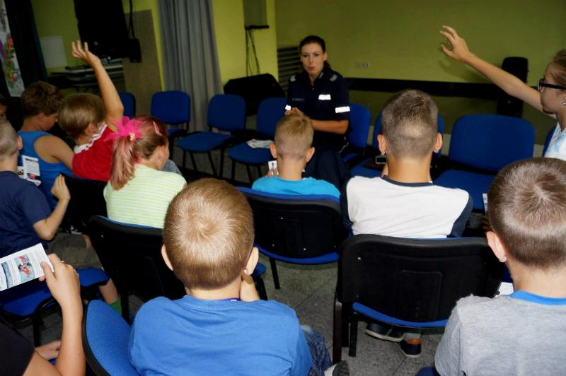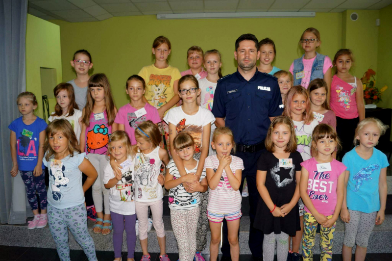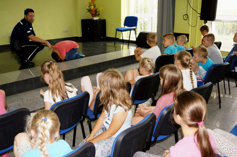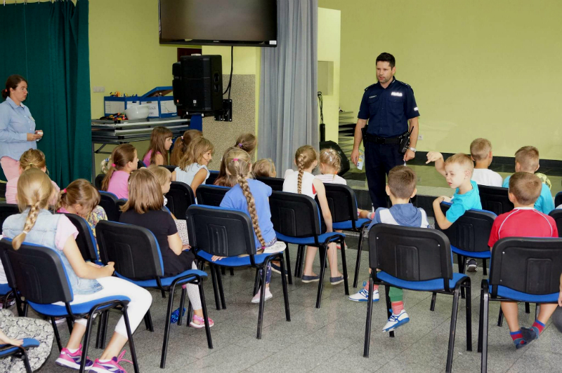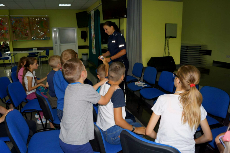 Policjanci przedyskutowali z dziećmi jak bezpiecznie zachowywać się na drodze, w domu czy na placu zabaw, uświadamiając ich jednocześnie kto to jest osoba obca i co zrobić kiedy ktoś taki będzie ich zaczepiać na podwórku. Dzieci uczyły się jak postępować, gdy zostaną zaatakowane przez zwierzę i ćwiczyły przybieranie postaw na tzw. „żółwia”. Omówili wspólnie wakacyjne wyjazdy informując jak zadbać o bezpieczeństwo będąc nad wodą czy w górach oraz dlaczego należy słuchać ratowników.