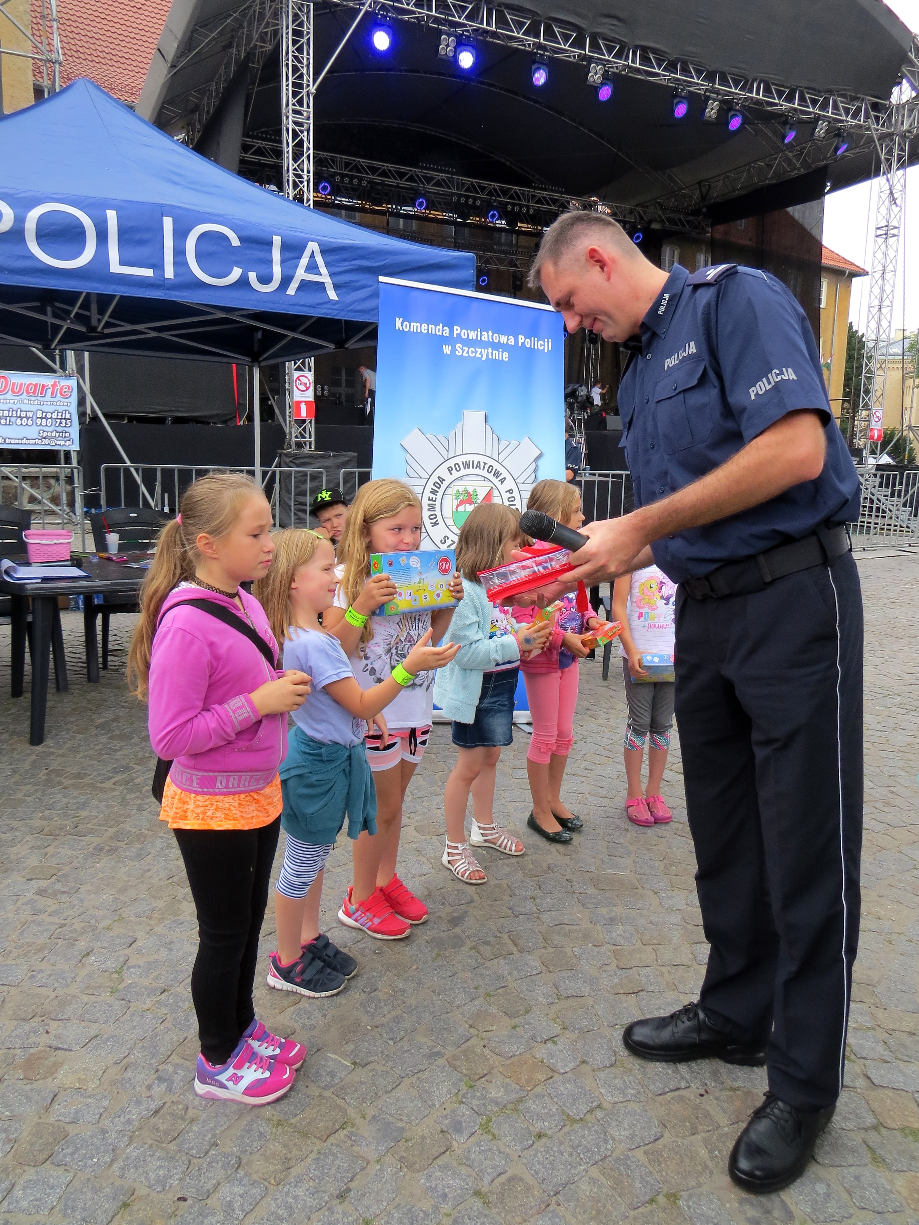 Każdy z organizatorów imprezy zaprezentował stoisko promujące swoją pracę oraz sprzęt i pojazdy wykorzystywane w codziennej służbie. Dzieci chętnie brały udział w konkursach. Ci najmłodsi mogli sprawdzić swoją wiedzę z zakresu przepisów ruchu drogowego oraz wykonać prace plastyczne nt. „Chcę być bezpieczny”. Dla zwycięzców w tych konkurencjach przygotowane były bardzo atrakcyjne nagrody, o które zadbali przedstawiciele Urzędu Miasta Szczytno i Lokalnej Organizacji Turystycznej.