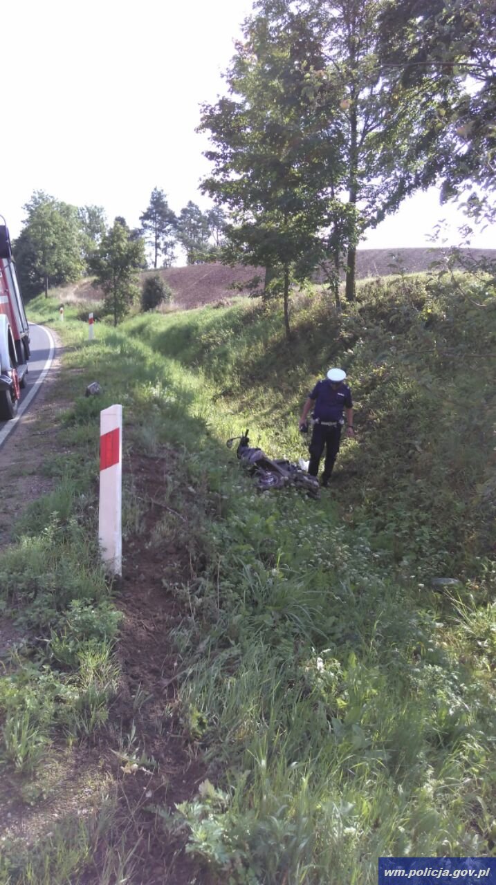 Policjanci pracowali na miejscu zdarzenia drogowego na trasie Bajtkowo-Nowa Wieś Ełcka. Do wypadku doszło około godziny 9:00. Z ustaleń funkcjonariuszy wynika, że 48-letni motorowerzysta stracił panowanie nad pojazdem i przewrócił się w przydrożnym rowie. O wypadku poinformowali policjantów świadkowie, którzy jechali za motorowerem.