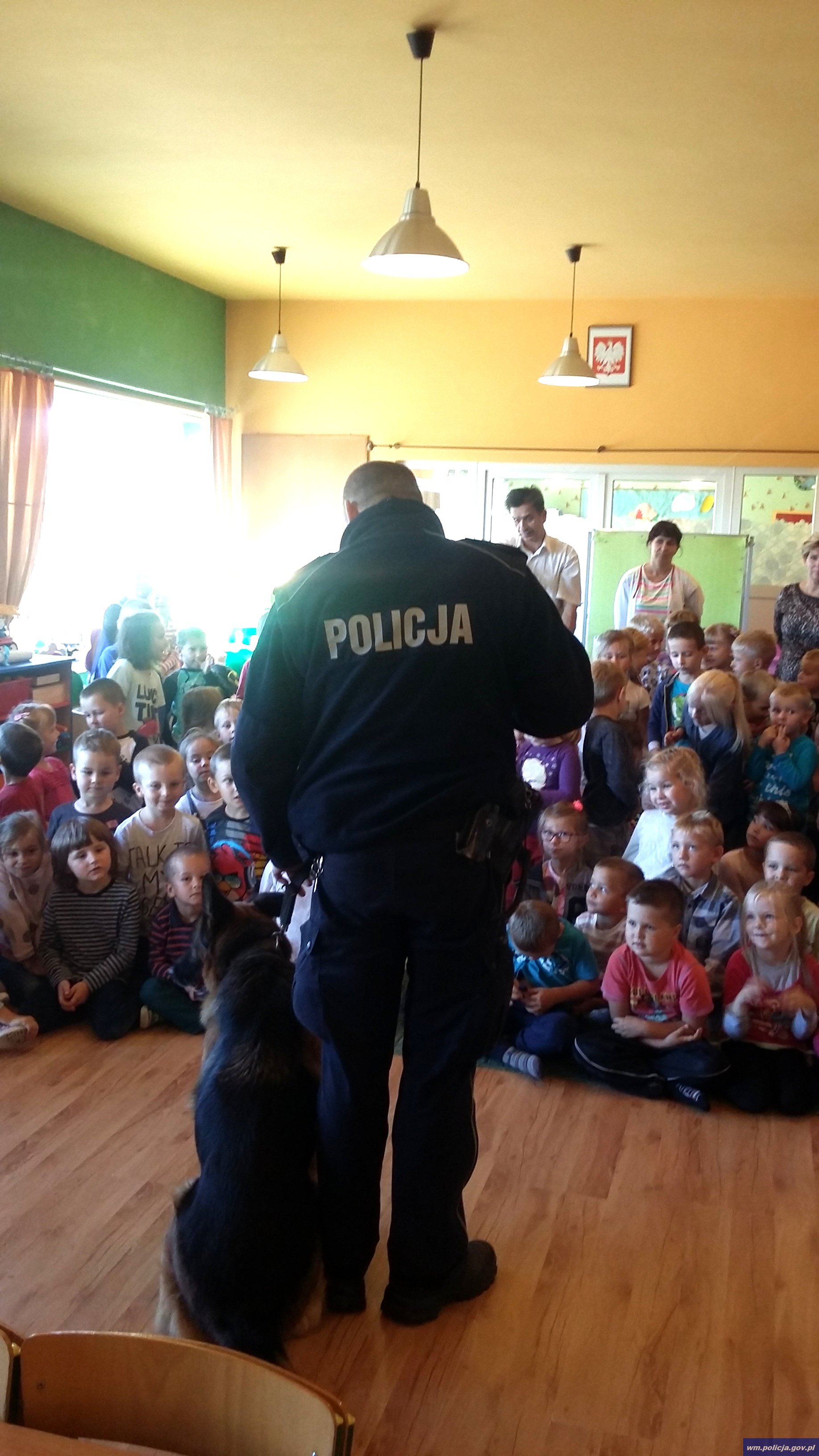 Podczas spotkania mł. asp. Rafał Jaworski opowiadał przedszkolakom m.in. o tym, na czym polega praca psa służbowego, jak wygląda opieka, higiena, karmienie psa oraz jak należy się zachować, gdy zaatakuje nas groźny czworonóg.