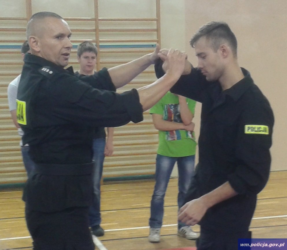 Zajęcia z zakresu samoobrony realnej odbyły się pod okiem wykwalifikowanych instruktorów i miały na celu przedstawienie uczniom podstawowych i skutecznych technik odpierania realnego ataku napastnika, a także zainteresowanie ich tematem własnego bezpieczeństwa. Młodzież po dynamicznej rozgrzewce uderzała, kopała i stosowała dźwignie na partnerze demonstrując w kolejnych ćwiczeniach indywidualne zainteresowanie proponowanym tematem. Każde zagadnienie było systematycznie kontrolowane przez policjantów pod kątem jego prawidłowego wykonania i bezpieczeństwa uczestników zajęć.