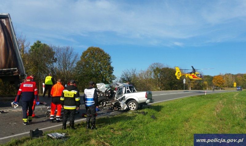Kilka minut po godzinie 14 oficer dyżurny iławskiej policji został poinformowany przez dzielnicowych będących w trakcie obchodu rejonu służbowego o wypadku drogowym z udziałem nissana oraz ciężarówki, na drodze krajowej nr 16. Po przekazaniu informacji funkcjonariusze natychmiast przystąpili do udzielania pomocy poszkodowanym oraz poinformowali służby ratunkowe. Po przyjeździe strażaków dzielnicowi wspólnie z nimi wyciągnęli kierowcę jak i pasażera nissana. Kierowca ciężarówki pojazd opuścił o własnych siłach. W trakcie dalszych czynności policjanci ustalili, że 26 – latka kierująca nissanem na łuku drogi przekroczyła oś jezdni zjeżdżając na przeciwległy pas ruchu, doprowadzając do zderzenia z zespołem pojazdów składających się z ciągnika siodłowego i naczepy. 26 – latka z ciężkimi obrażeniami została przetransportowana helikopterem Lotniczego Pogotowia Ratunkowego do szpitala w Olsztynie, natomiast pasażer pojechał do szpitala w Iławie. Teraz policjanci będą dokładnie wyjaśniać okoliczności tego zdarzenia.