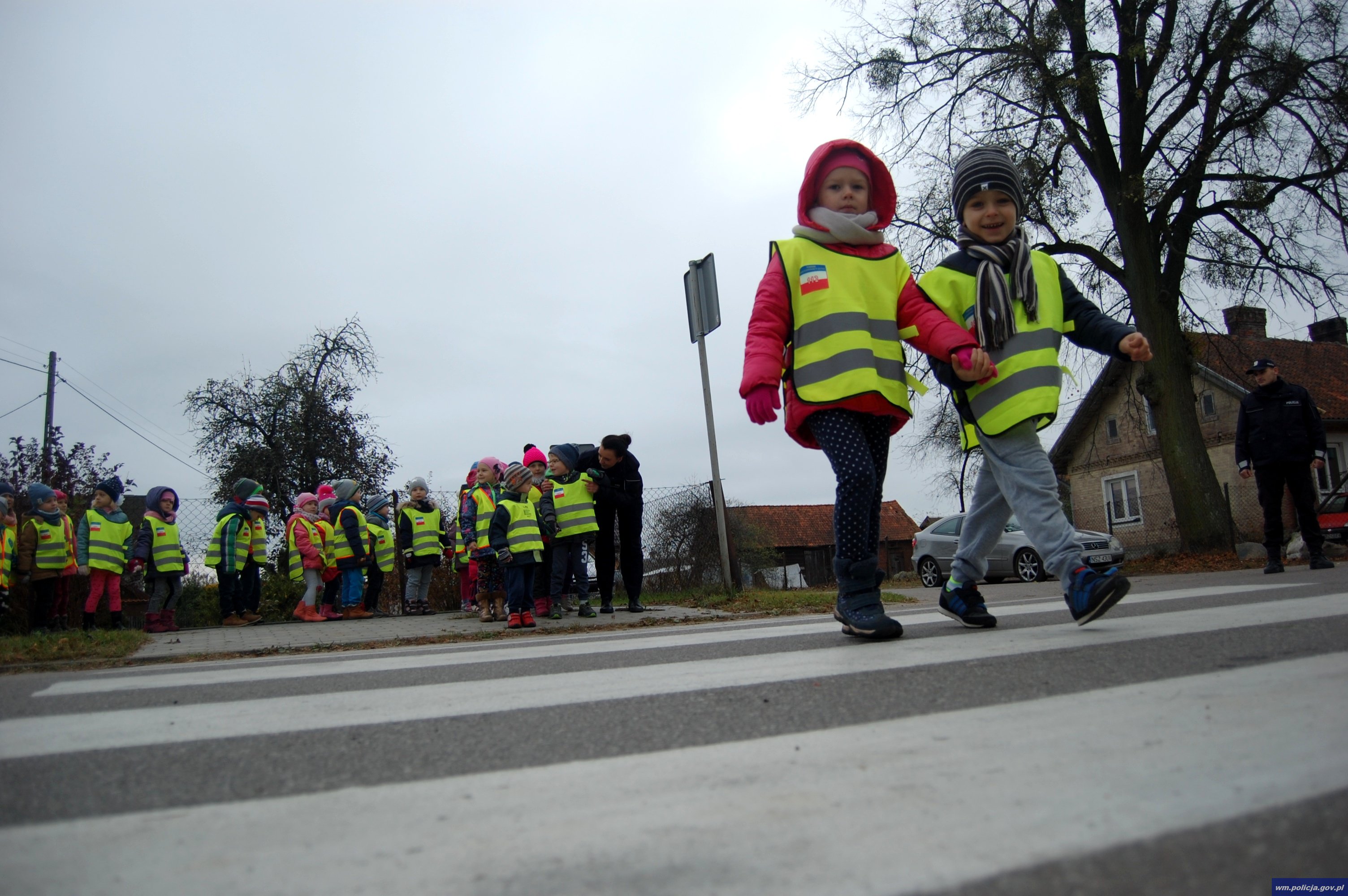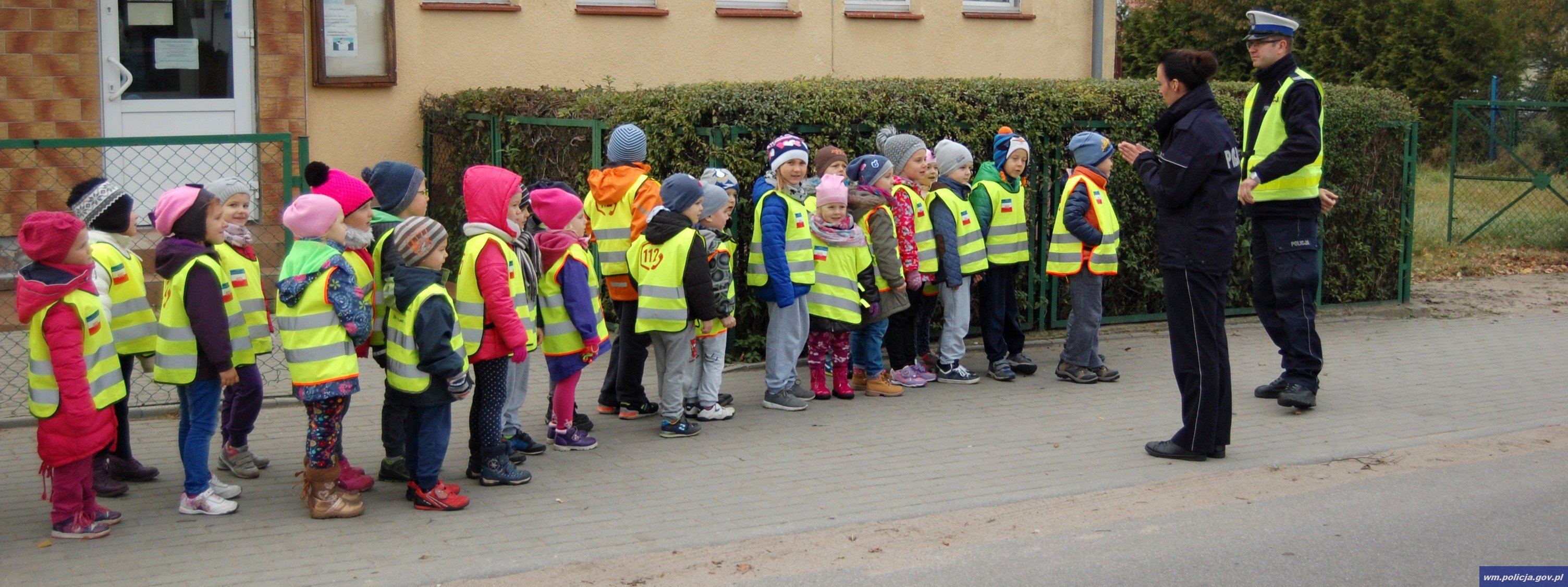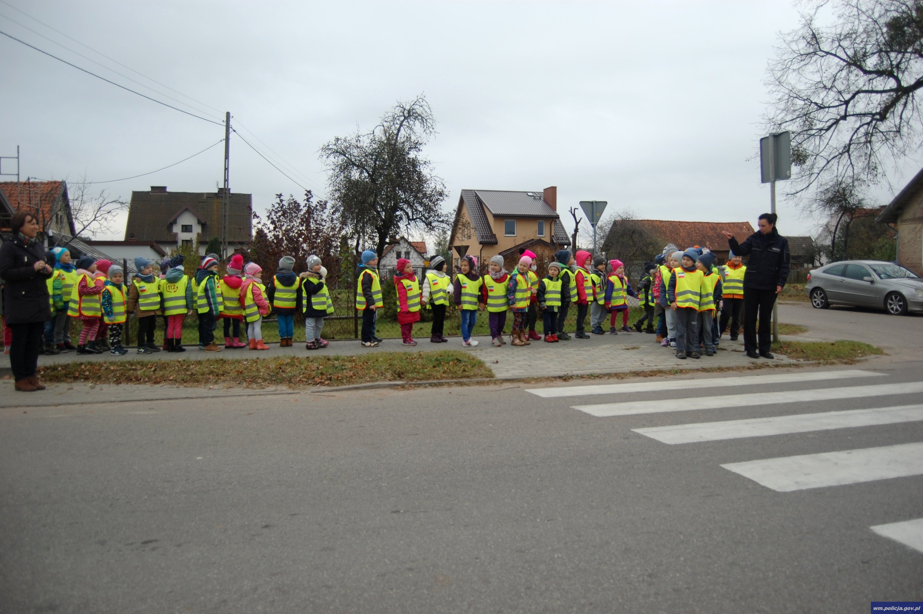 Następnie dzieci pod czujnym okiem, sierż. sztab. Przemysława Gastołka oraz post. Ariela Wójcik miały okazję w sposób praktyczny przećwiczyć umiejętność prawidłowego przekraczania jezdni. Funkcjonariusze wytłumaczyli także przedszkolakom dlaczego takie małe przedmioty jak odblaski są ważne dla ich bezpieczeństwa. Rano podczas drogi do przedszkola i po południu, kiedy dzieci wracają z rodzicami do domu, widoczność na drogach może być ograniczona. Szczególnie ważne jest, aby odblaski były noszone na wierzchniej odzieży jesienią i zimą. Element odblaskowe pozwalają dostrzec pieszego z odległości co najmniej 150 metrów w różnych warunkach pogodowych. Daje to szansę kierowcy na podjęcie manewru hamowania czy bezpiecznego ominięcia takiej osoby w sposób nie zagrażający jej bezpieczeństwu.